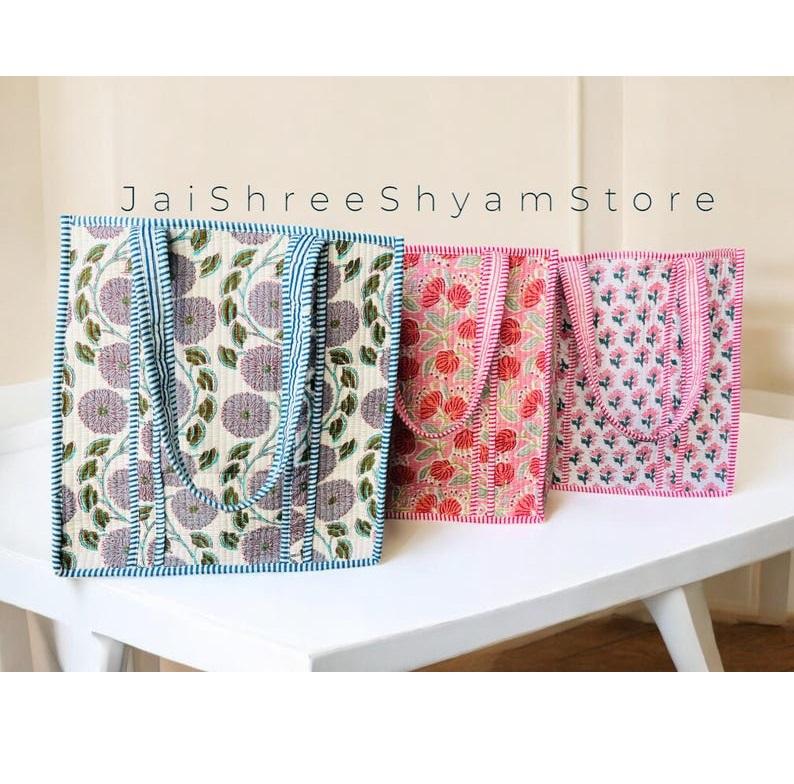 กระเป๋าอเนกประสงค์สำหรับใช้ในชีวิตประจำวัน ทำจากผ้าฝ้ายลายควิลท์ พิมพ์ลายดอกไม้ด้วยมือ เหมาะสำหรับการช้อปปิ้ง การเดินทาง และการใช้งานในที่ทำงาน