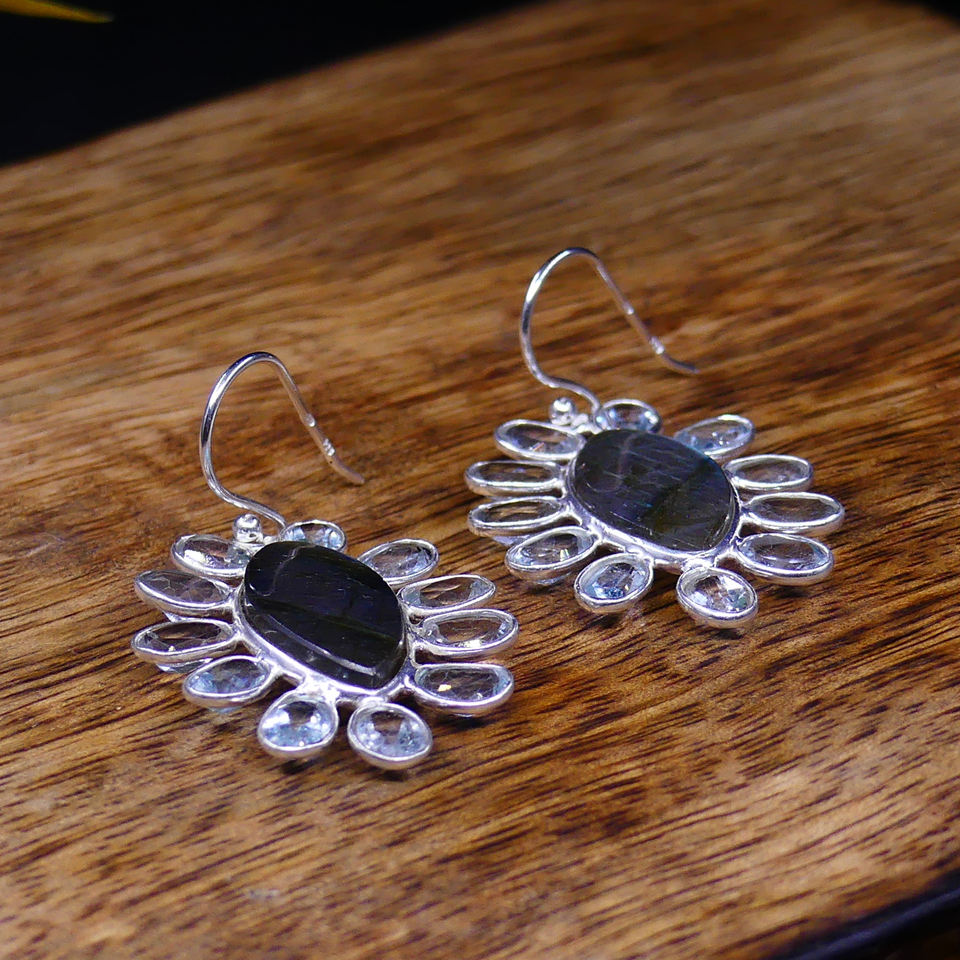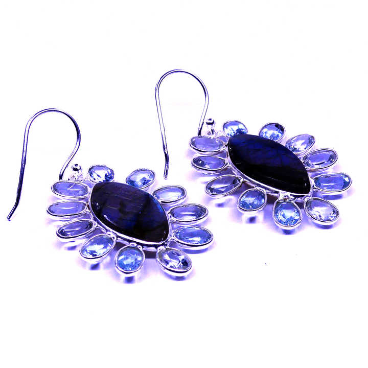 ใส่ได้ทุกวัน925เงินสเตอร์ลิงสีทองเครื่องประดับลาบราโดไรต์สีฟ้าบุษราคัมต่างหูแขวน