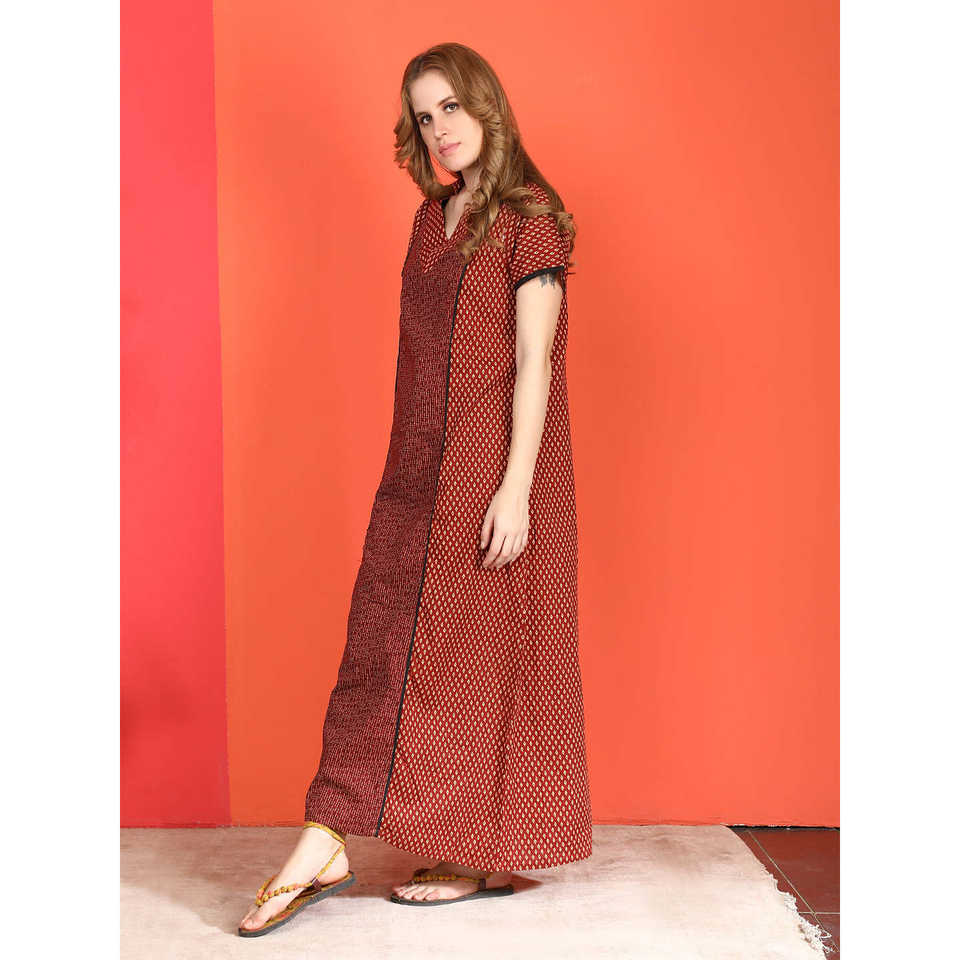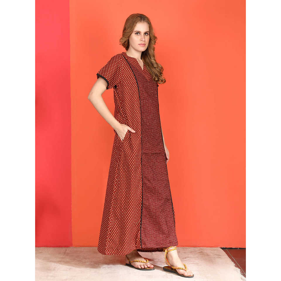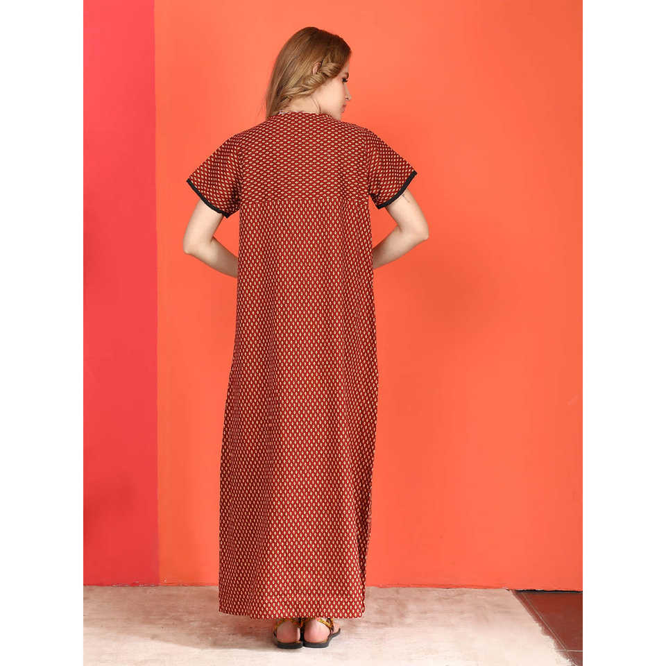 Evolove Women's Casual Cotton Nighty Maxi Printed Short Sleeves Full-Length Sleep Robe Side Pocket Buttoned XS Soft Woven
