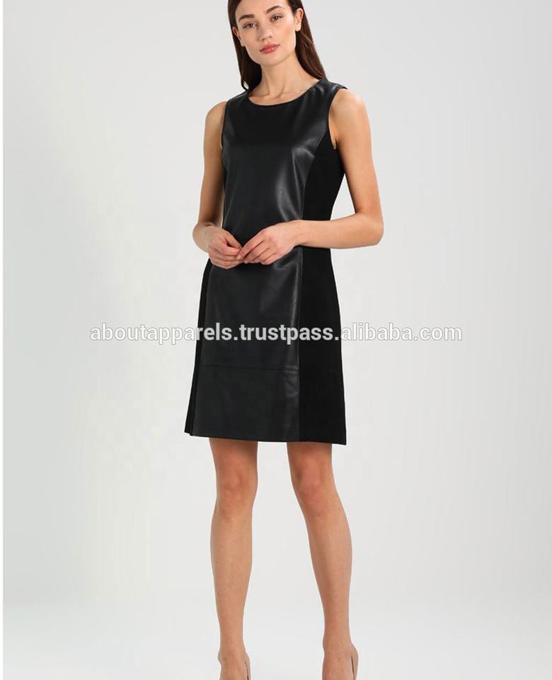 ชุดเดรสหนังสีดำสำหรับผู้หญิงชุดเดรสหนังขนแกะติดแขนสั้นมีสายคล้องคอแต่งระบาย