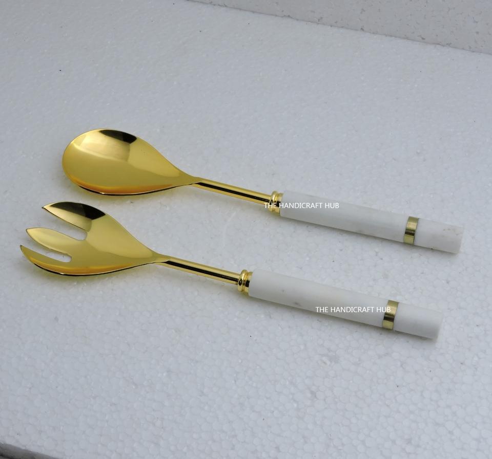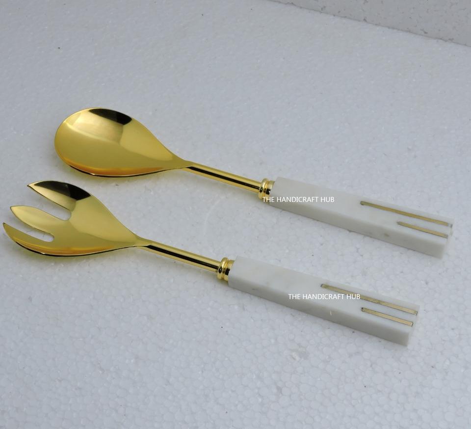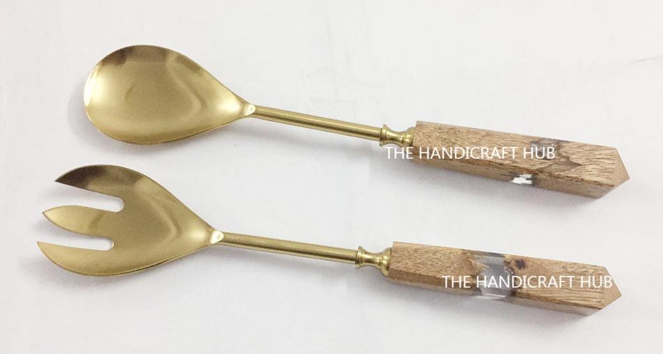 ชุดช้อนสลัดโลหะทองเหลืองคุณภาพเยี่ยม 2 ชิ้น พร้อมด้ามจับเรซิ่นไม้