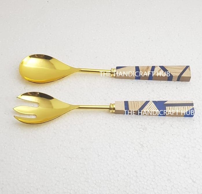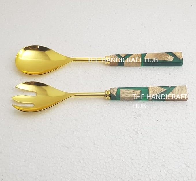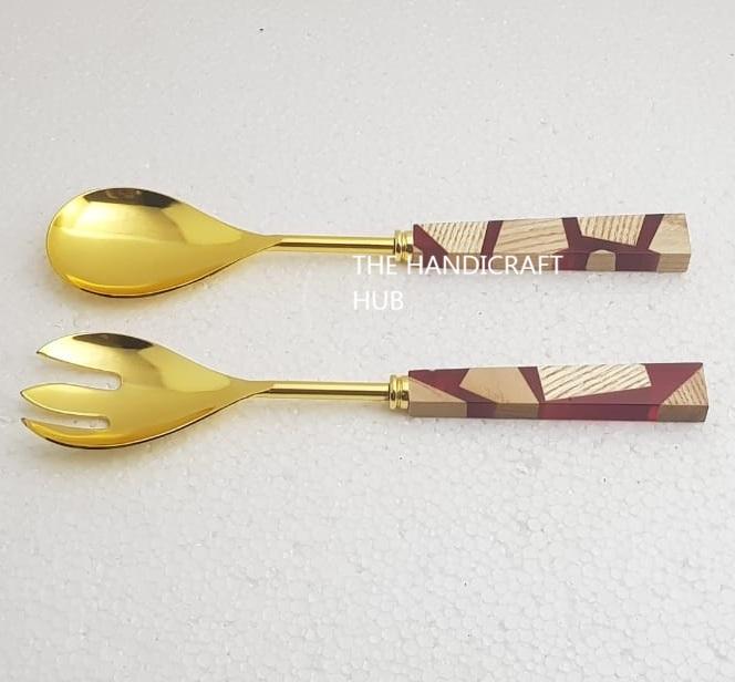 ชุดอุปกรณ์เสิร์ฟสลัดทองเหลืองคุณภาพเยี่ยม 2 ชิ้น ด้ามจับทำจากไม้เรซิ่น หรือช้อนสลัดพร้อมด้ามจับไม้เรซิ่น
