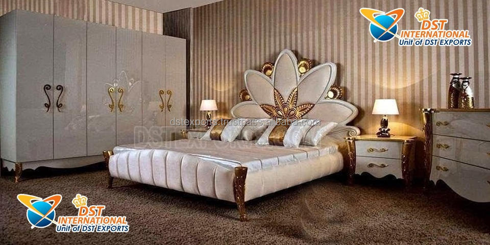 เตียงควีนไซส์สไตล์บาร็อค,เตียงแกะสลักไม้ทันสมัยพร้อมสตูลข้างเตียงมหาราชาแกะสลักด้วยมือหลังสูง