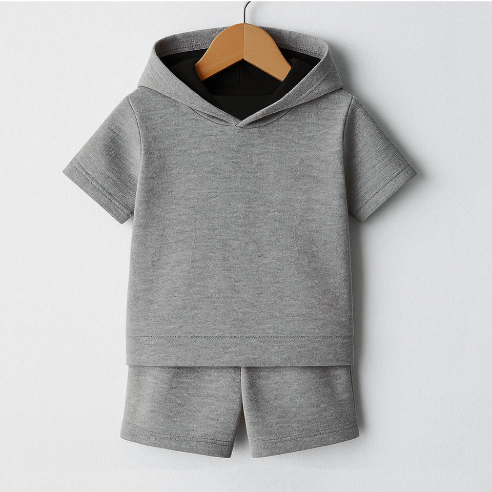 ชุดเสื้อผ้าเด็กผู้ชายมีฮู้ดและกางเกงขาสั้นลำลองสีพื้นสำหรับฤดูร้อน