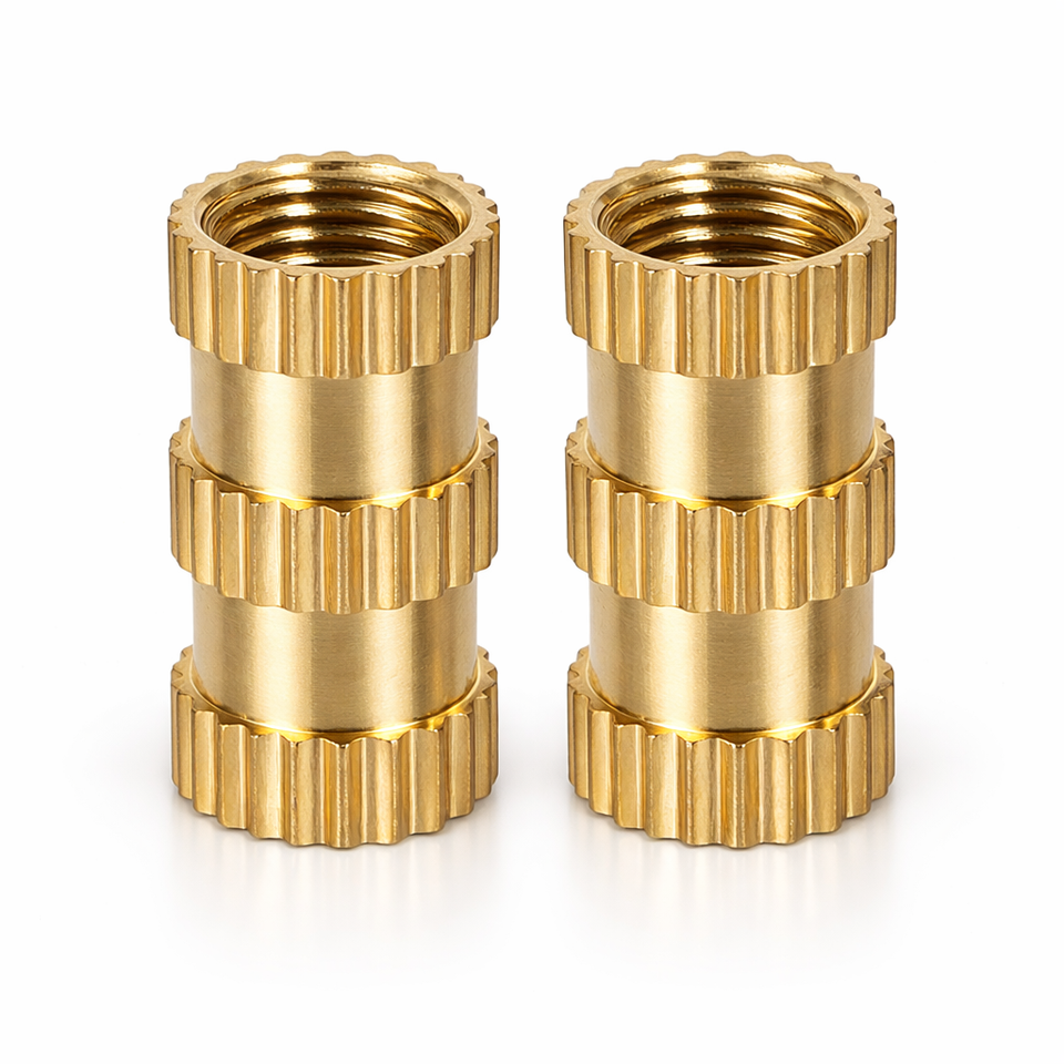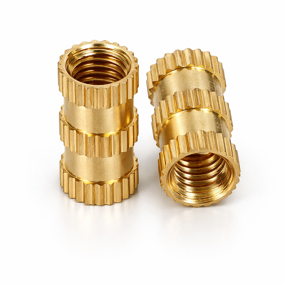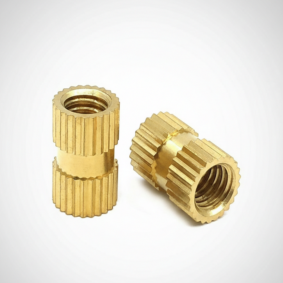น็อตฝังแบบมีลายกันลื่น ผลิตจากทองเหลืองด้วยเครื่อง CNC คุณภาพเยี่ยม สำหรับงานฉีดพลาสติก มีจำหน่ายในราคาโรงงาน