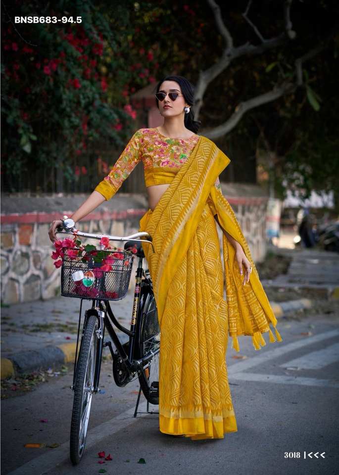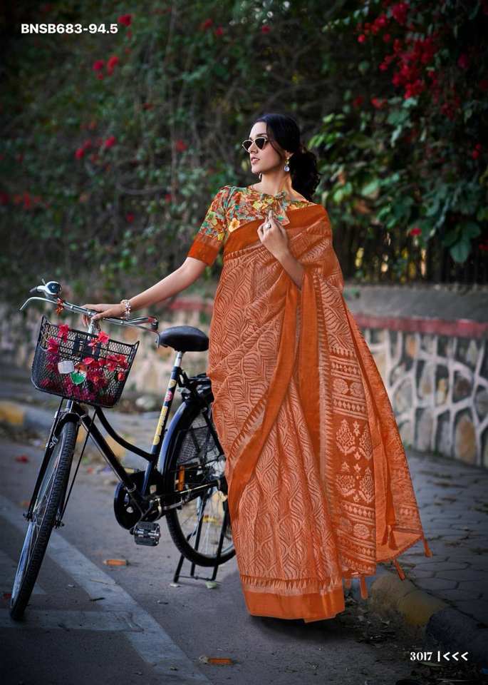 ชุดส่าหรีผ้าบรัสโซพิมพ์ลาย พร้อมเสื้อเบลาส์ลายดอกไม้สีสันสดใส
