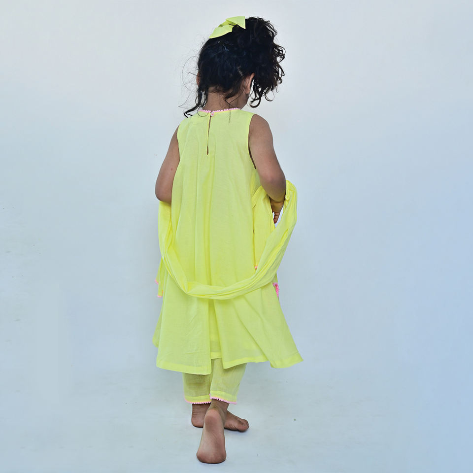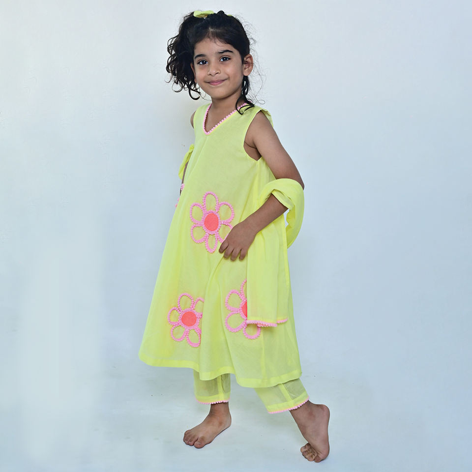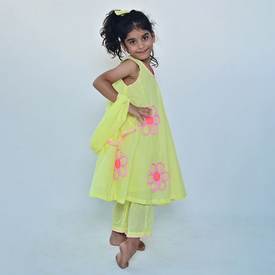 คุณภาพเยี่ยม สีเหลืองอ่อน คอวี แต่งลายละเอียดอย่างประณีตบนเสื้อคุर्ติสำหรับเด็ก ชุดเดรสใส่สบายสำหรับงานปาร์ตี้ ราคาดีที่สุด