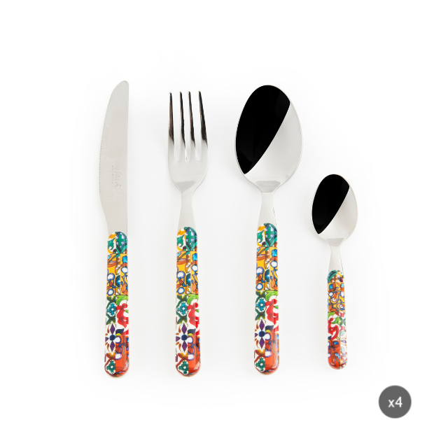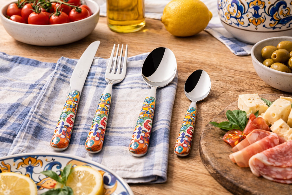 ชุดช้อนส้อมสแตนเลสสตีลทนทาน 16 ชิ้น ขัดเงาแบบกระจก ดีไซน์เรขาคณิตหลากสีสัน ลายมาโจลิกา ลิสบอนา โดยเอ็กเซลซา
