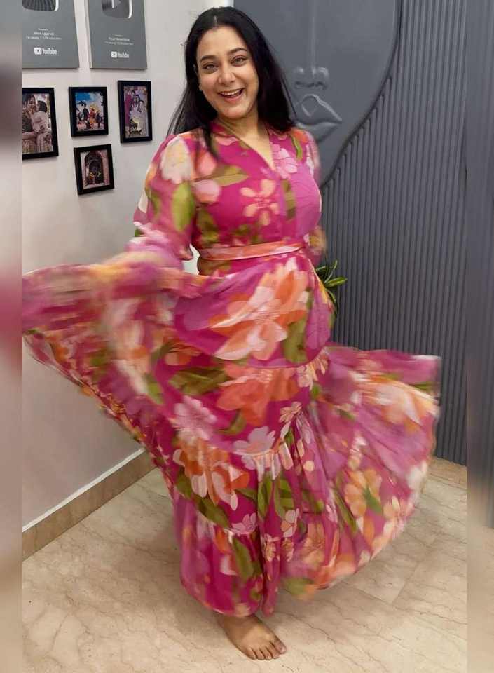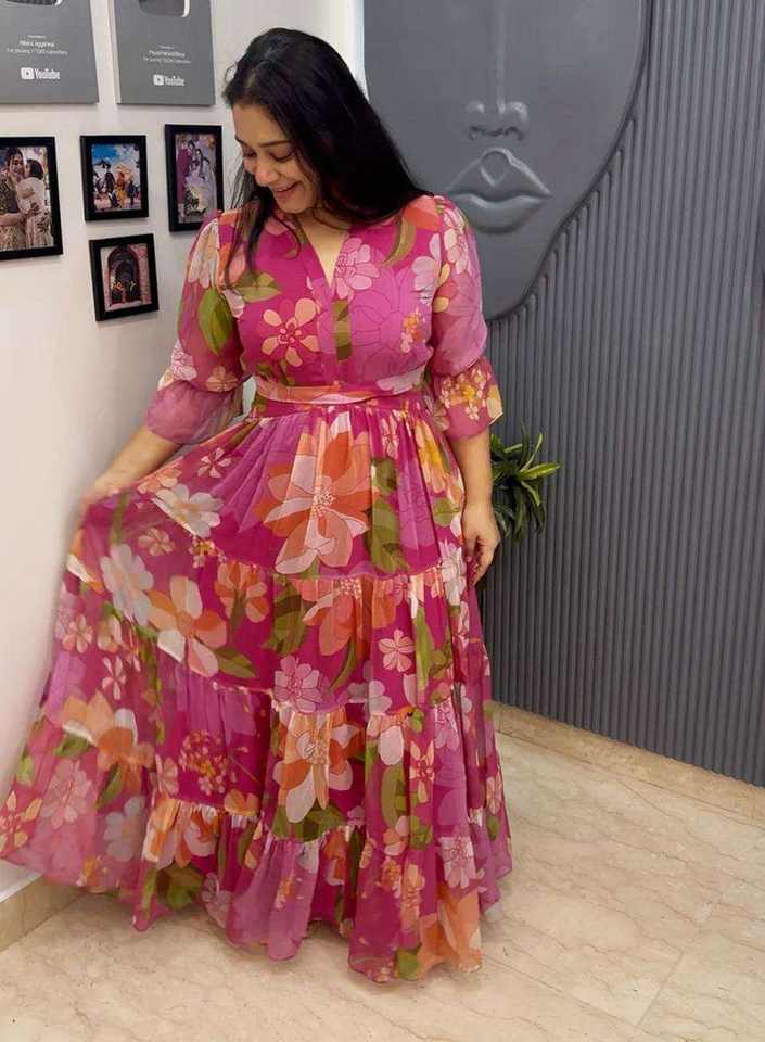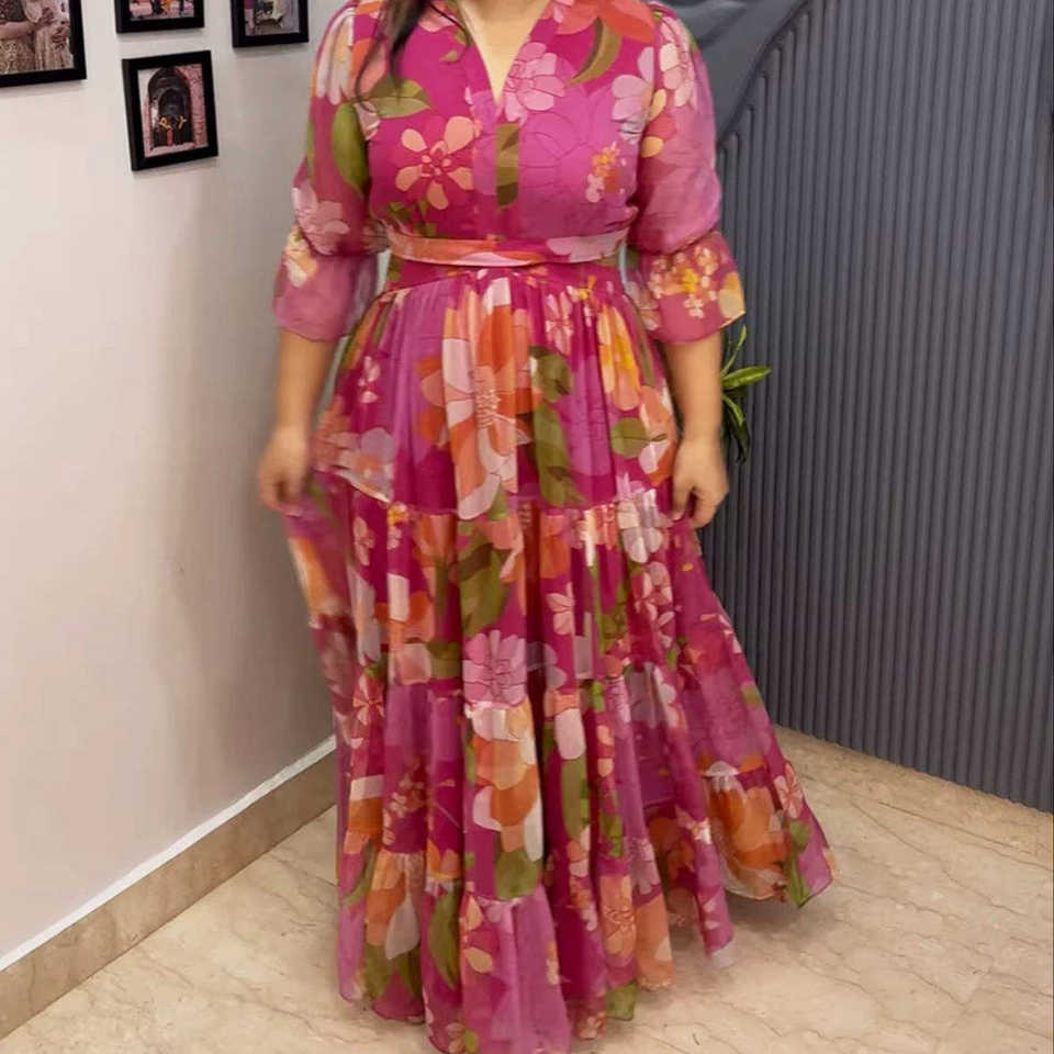 ชุดเดรสยาวปานกลางทรงเอไลน์ ผ้าจอร์เจตต์พิมพ์ลายดอกไม้สไตล์อินเดีย ดีไซน์แบบอานาร์กาลี สำหรับผู้หญิง ผ้าไม่ยับ ระบายอากาศได้ดี ดีไซน์ล่าสุดจากดีไซเนอร์