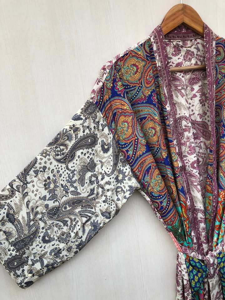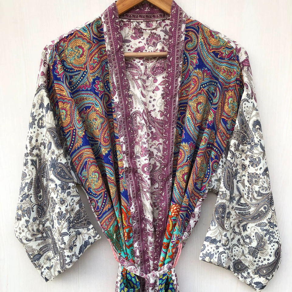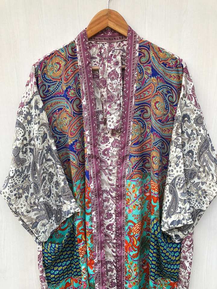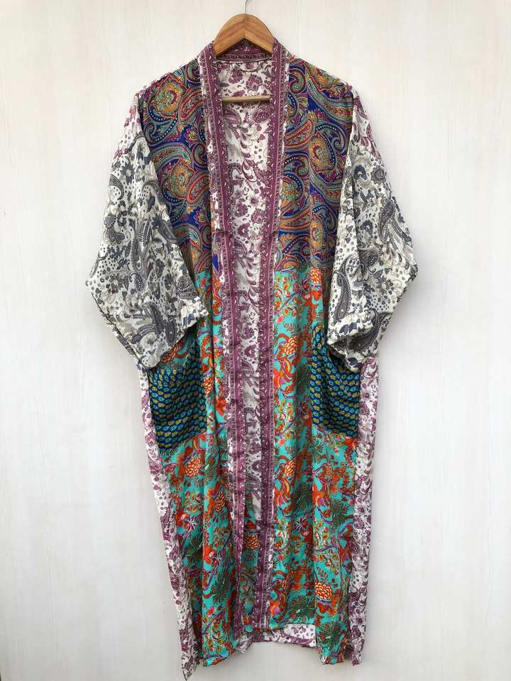 ชุดคลุมกิโมโนผ้าไหมอาร์ตสุดพิเศษ ชุดเดรสโบโฮ ชุดส่าหรีอินเดีย ชุดชายหาด ความยาวระดับเข่า ชุดนอนโบโฮลายพิมพ์สำหรับฤดูใบไม้ร่วง ชุดคลุม