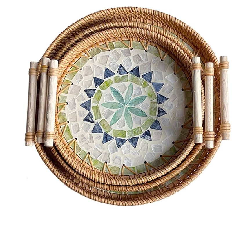 ถาดไม้หวายและเปลือกหอยมุก 3 ชิ้น ขนาดต่างกัน ดีไซน์พิเศษ สำหรับโรงแรม/ร้านอาหาร ใช้เก็บอาหารบนโต๊ะ