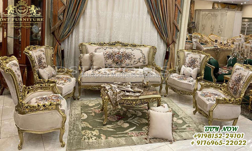 การออกแบบพิเศษโซฟาห้องนั่งเล่นพร้อมโต๊ะชุดโซฟาเสร็จสิ้นสีทองซื้อชุดโซฟาไม้แกะสลักมือ