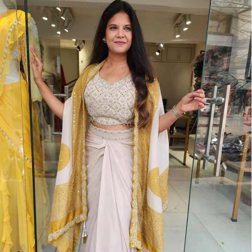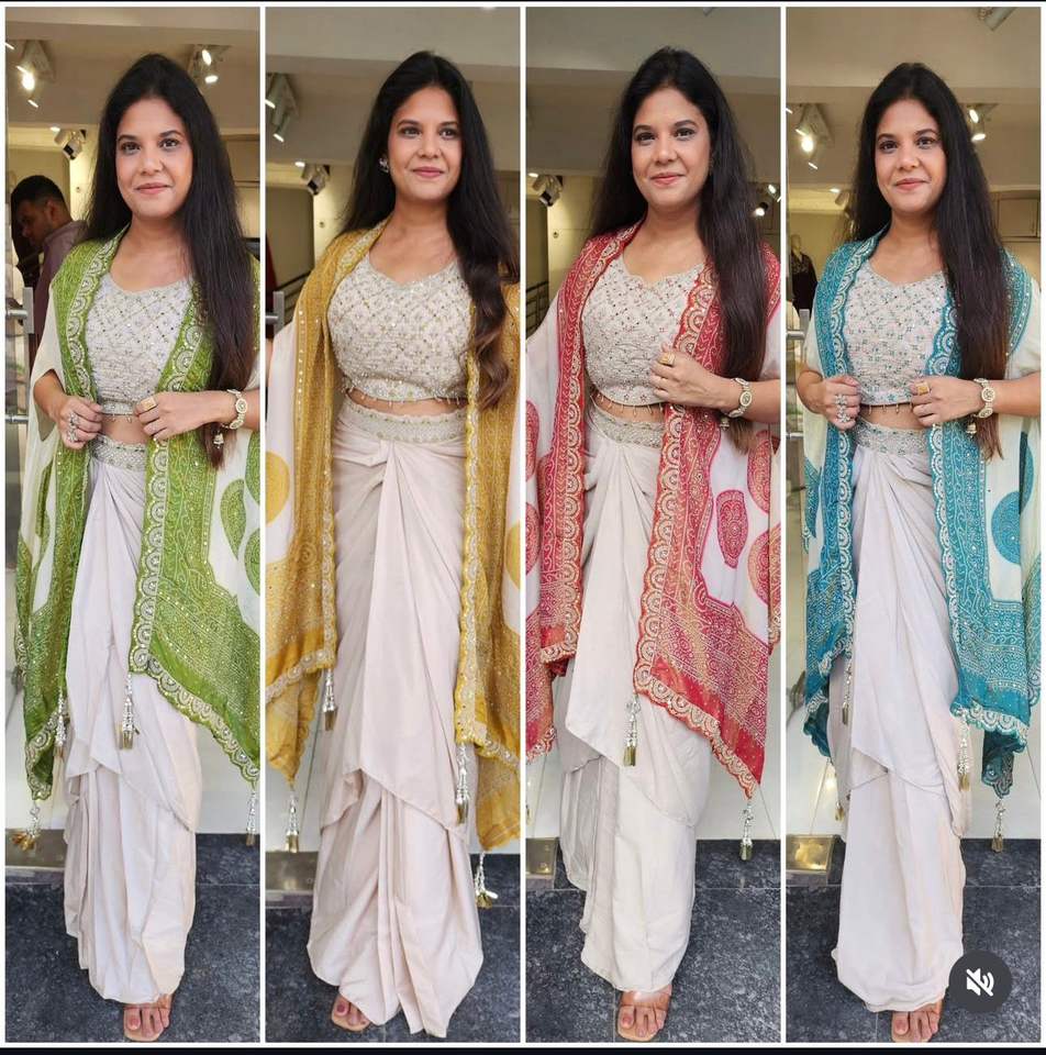 ผ้าไหมครีปซารีดีไซน์เนอร์สุดพิเศษ พร้อมเสื้อคลุมหรูหรา ปักลายทันสมัย สไตล์อินเดีย เรียบร้อย เหมาะสำหรับงานปาร์ตี้ สำหรับผู้หญิง