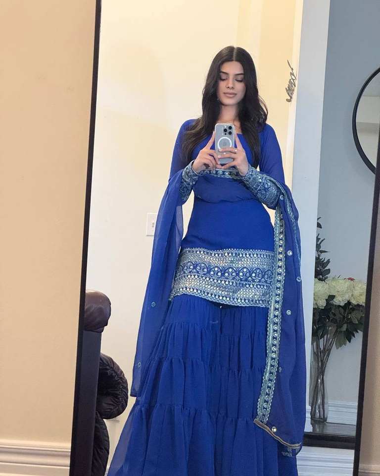 ชุดเดรสงานออกแบบพิเศษ ผ้าจอร์เจตต์เทียม ประดับเลื่อมปักลายสวยงาม พร้อมผ้าคลุมไหล่แบบ Latkan Dori Sharara ชุดดูปัตตา ผ้าแท้