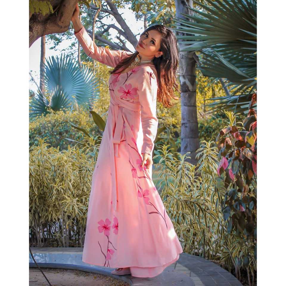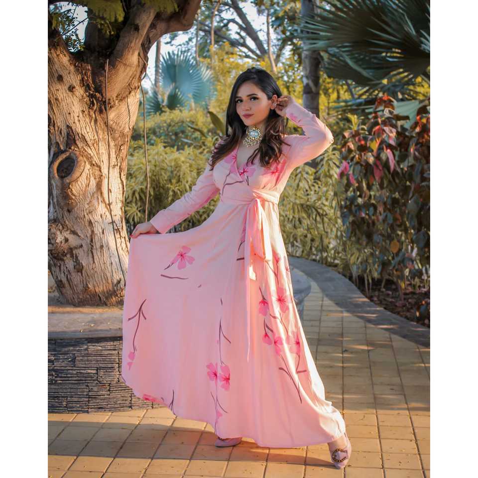 Exclusive Hand Painted Peach Bermuda Dress V-neck Floral Print Breathable Loose Silhouette XS Size Natural Waistline Party