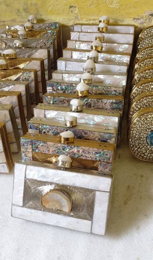 กระเป๋าคลัทช์งานฝีมือสุดหรู ดีไซน์เก๋สำหรับเจ้าสาว ทำจากทองเหลืองและเปลือกหอยมุก | คราฟท์สเตจส์ อินเตอร์เนชั่นแนล ชุดราตรีสังเคราะห์แบบปิดด้วยแม่เหล็ก