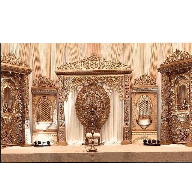 อุปกรณ์ตกแต่งเวทีงานแต่งงานงานแบบเฉพาะของชาวฮินดูในเวทีงานแต่งงานงานบอลลีวู้ดเวทีงานแต่งงานแบบอินเดียแกะสลักสีทองระยิบระยับ