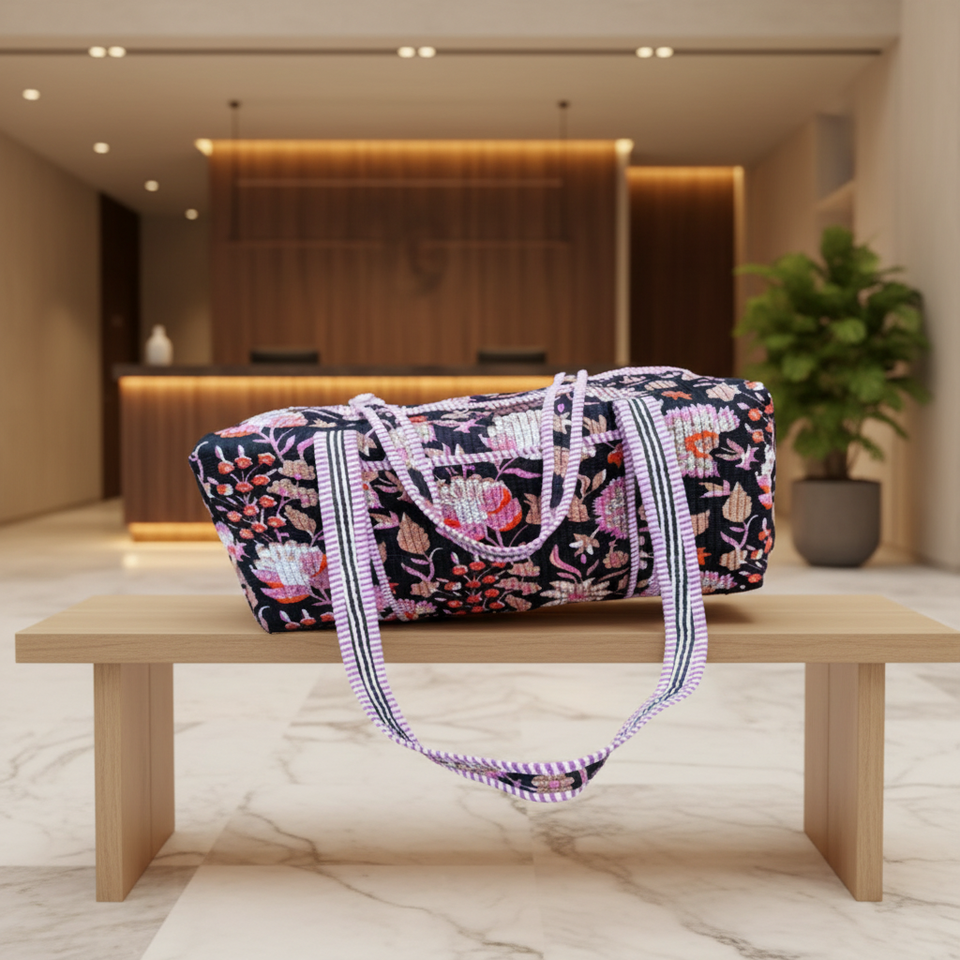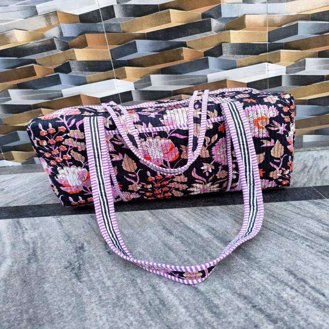 กระเป๋าเดินทางสุดหรู ทนทาน ขนาดใหญ่ ทำจากผ้าฝ้าย สำหรับเดินทางช่วงสุดสัปดาห์ งานแฮนด์เมด ผ้าควิลท์ พิมพ์ลายบล็อก กระเป๋าถือขึ้นเครื่อง