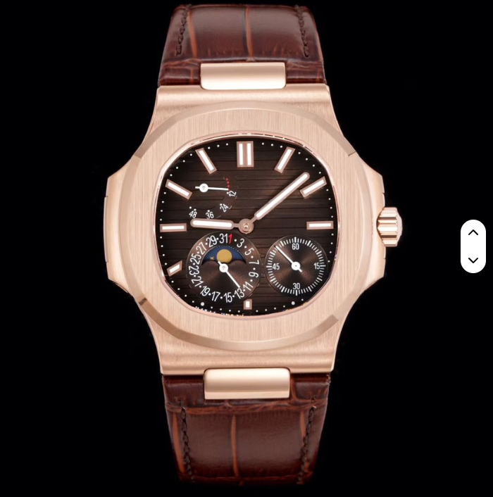 นาฬิกาดำน้ำสำหรับผู้ชาย ตัวเรือนสี่เหลี่ยมสีโรสโกลด์ขัดเงา สายผ้าสีน้ำตาลเข้ม หน้าปัดสีดำหลายแบบ พร้อมฟังก์ชันมูนเฟสและโครโนกราฟ