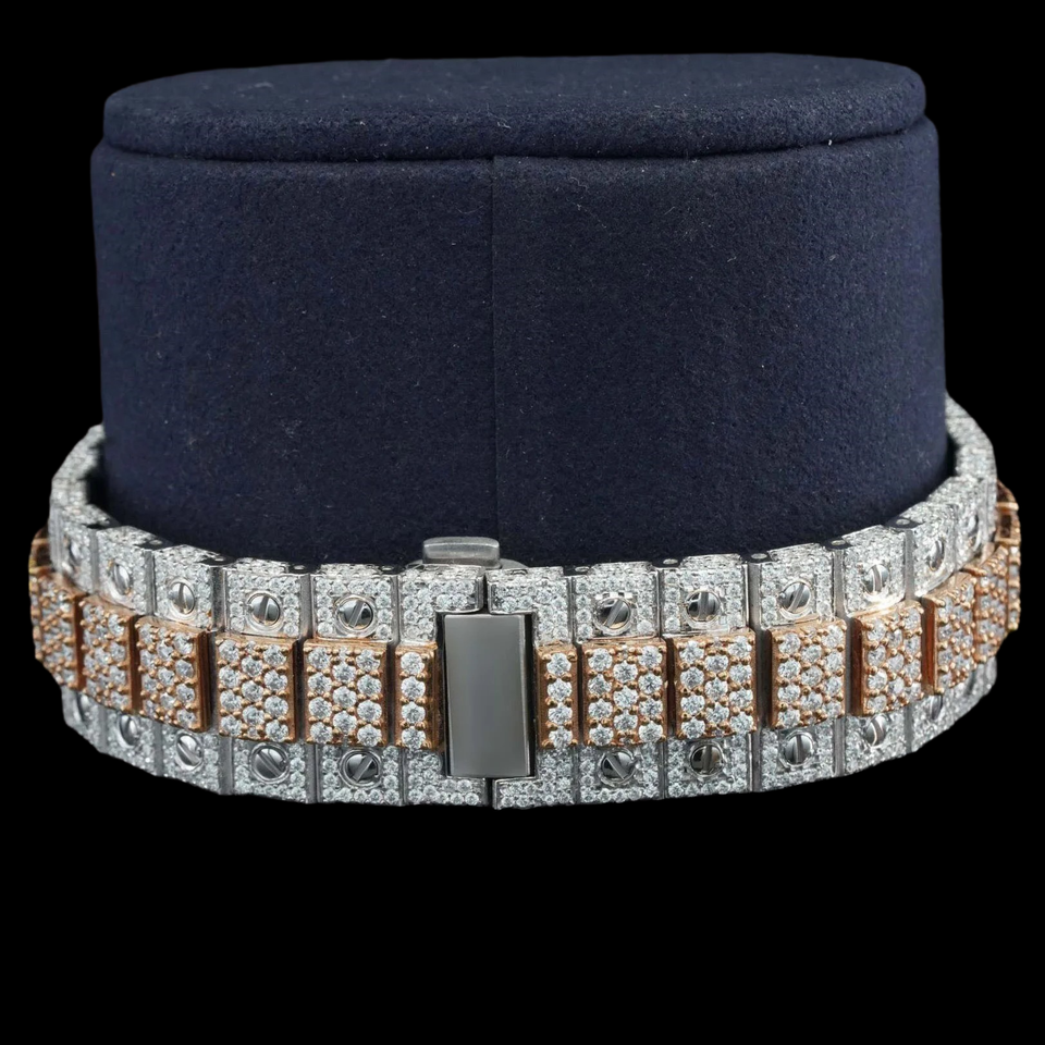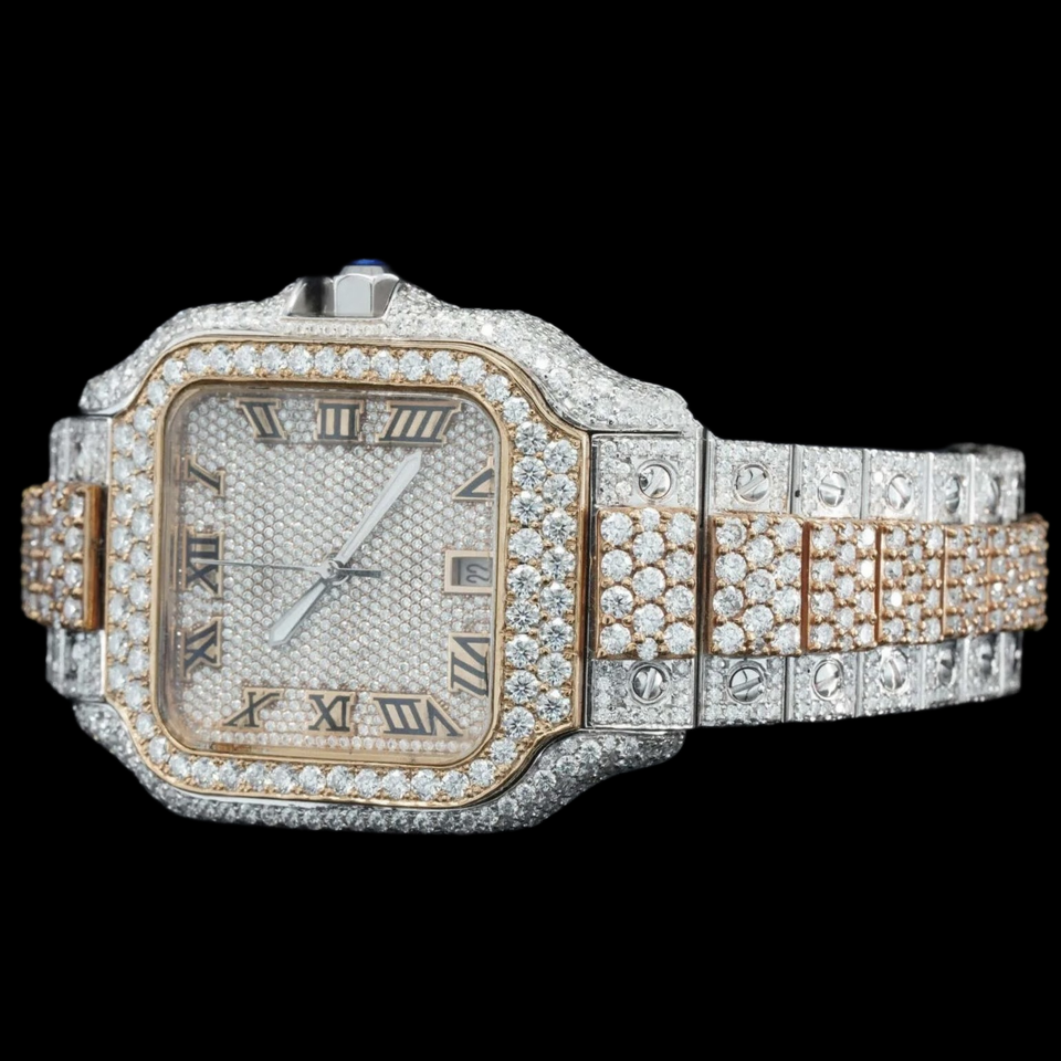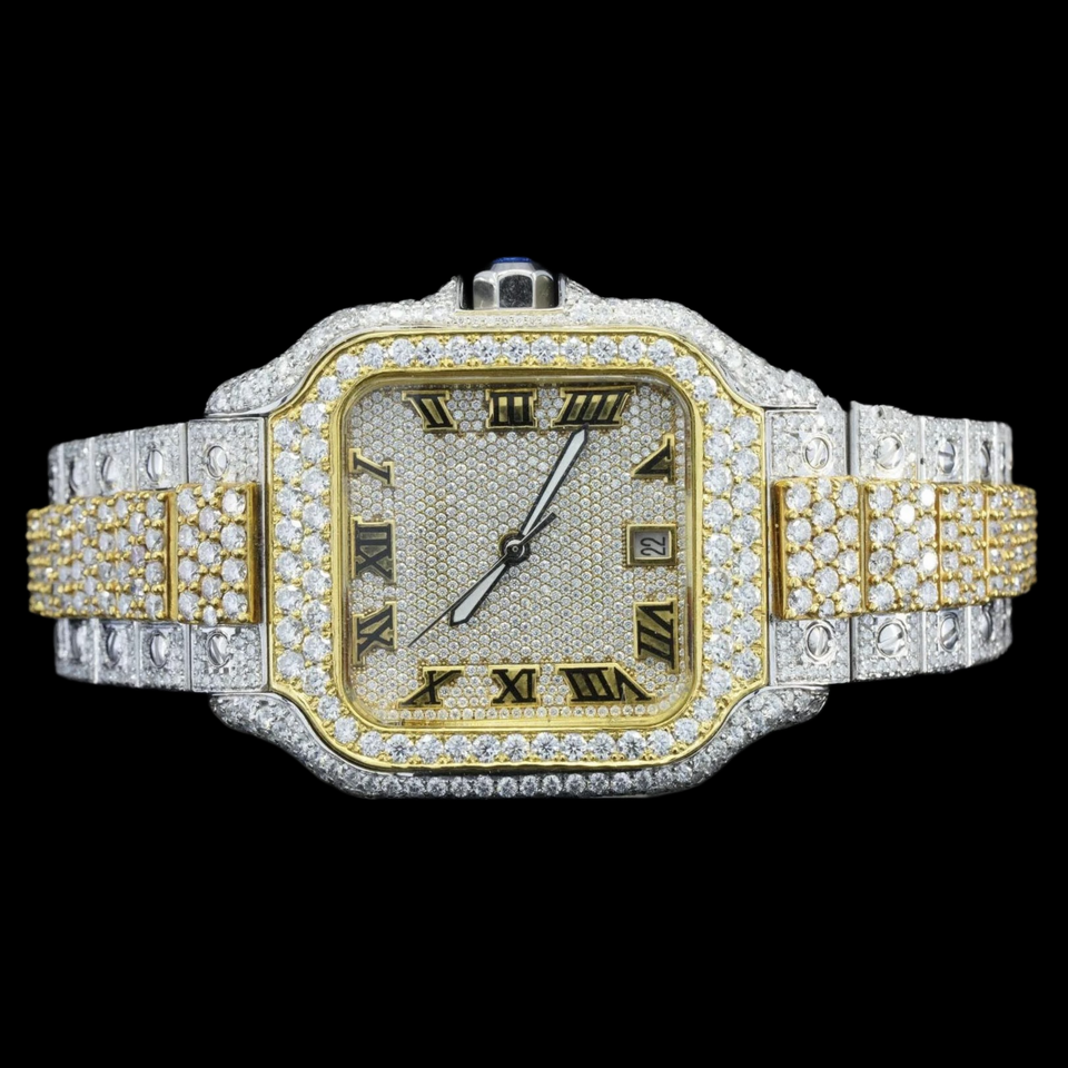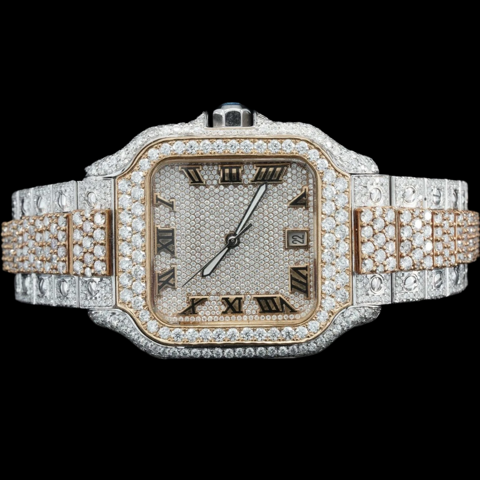 นาฬิกาพรีเมียมประดับเพชรโมอิสซาไนต์ทรงกลม ดีไซน์ฮิปฮอป ตัวเรือนทรงเหลี่ยม ตัวเลขโรมัน คลาสสิก สองสี ประดับเพชรเต็มเรือน