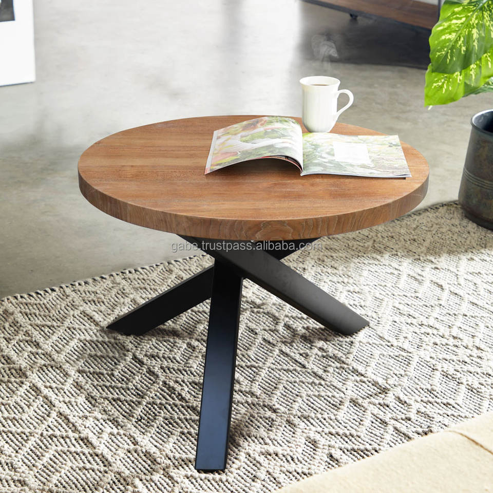 โต๊ะกาแฟทรงกลมไม้สักแท้ ขนาดเส้นผ่านศูนย์กลาง 70 ซม. ขาเหล็ก ดีไซน์พิเศษ