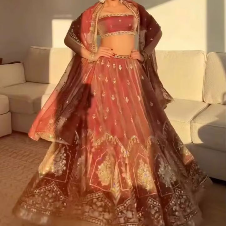 เลเฮนกาโชลีผ้าไหมรัสต์สุดพิเศษพร้อมงานปักดิ้น เลเฮนกาโชลีสำหรับงานแต่งงานจากดีไซเนอร์