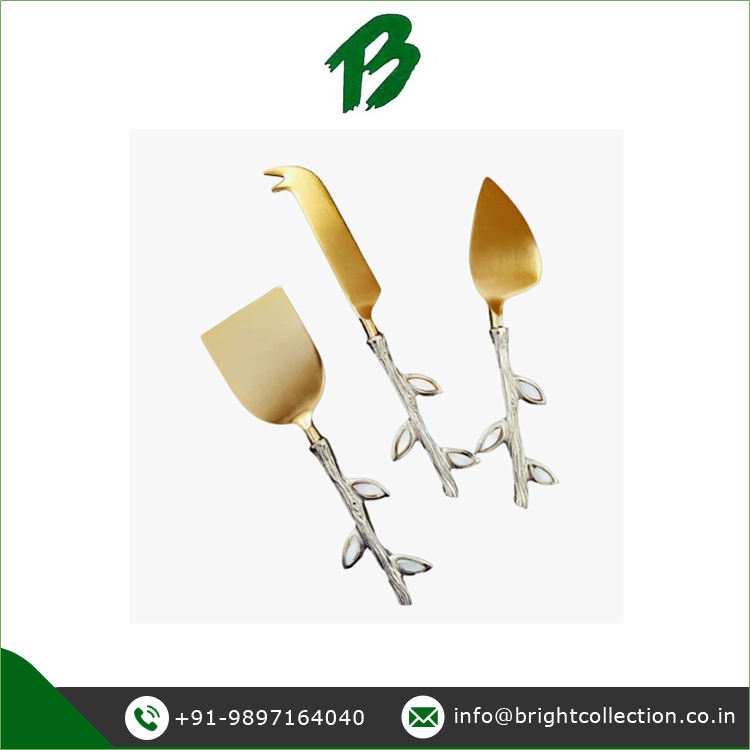 ขายพิเศษของมีดชีสสแตนเลสด้ามใบทองเหลืองสีทองและสีเงินสําหรับผู้ซื้อจํานวนมาก