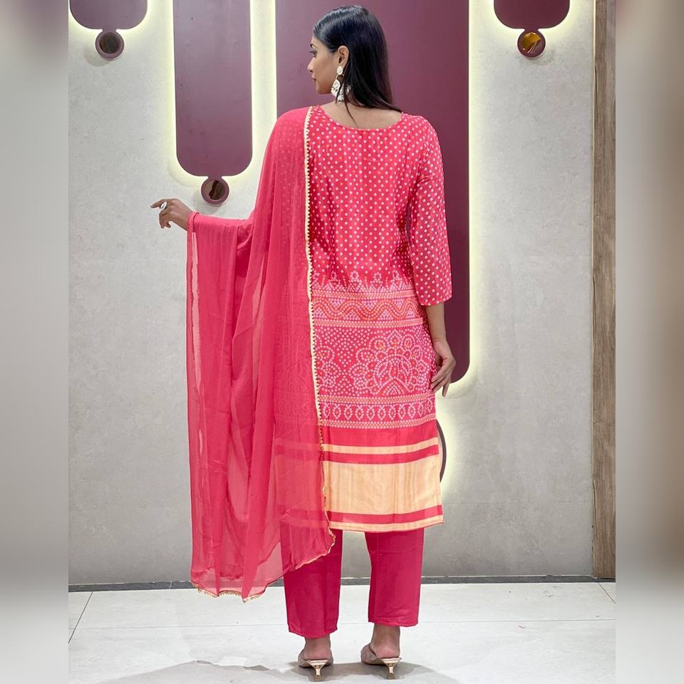 ชุดคุर्ติผ้าชีนอนพิมพ์ลายบันดานี ดีไซน์พิเศษ พร้อมงานปัก คอวี และผ้าคลุมไหล่ สำหรับงานเทศกาล หรูหรา พรีเมียม สไตล์ชาติพันธุ์