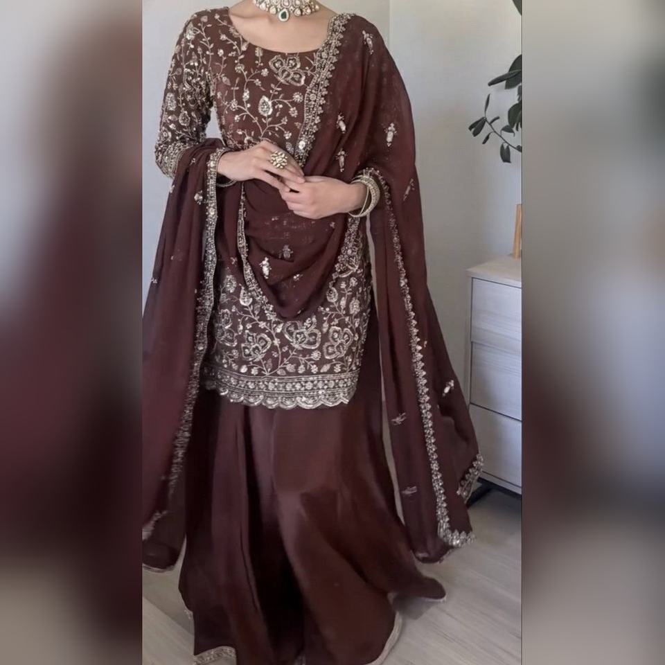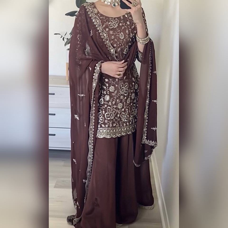 ชุดชารารา ซาลวาร์ คามีซ ผ้าจอร์เจตต์สุดพิเศษ พร้อมเสื้อปักลายอย่างดีและกางเกงพลลาซโซ พร้อมผ้าคลุมไหล่ เหมาะสำหรับใส่เที่ยวแบบสบายๆ