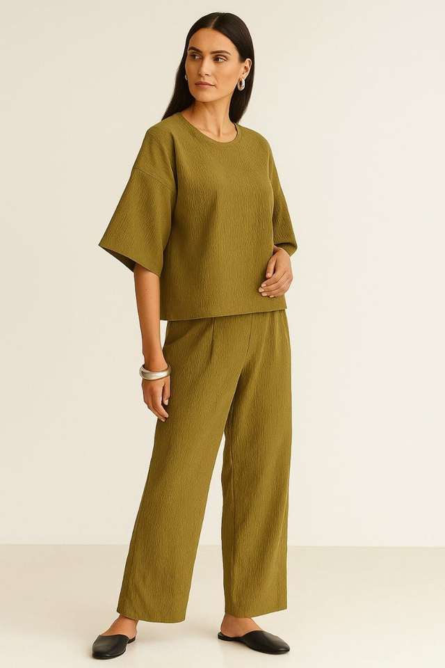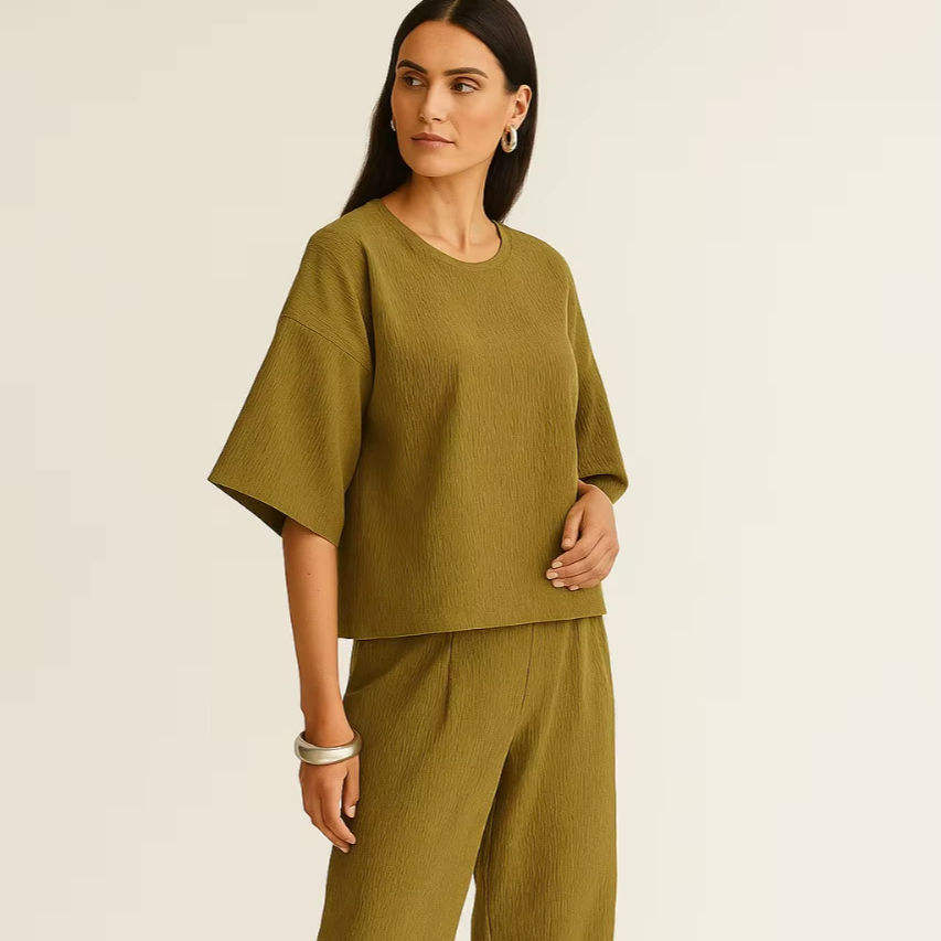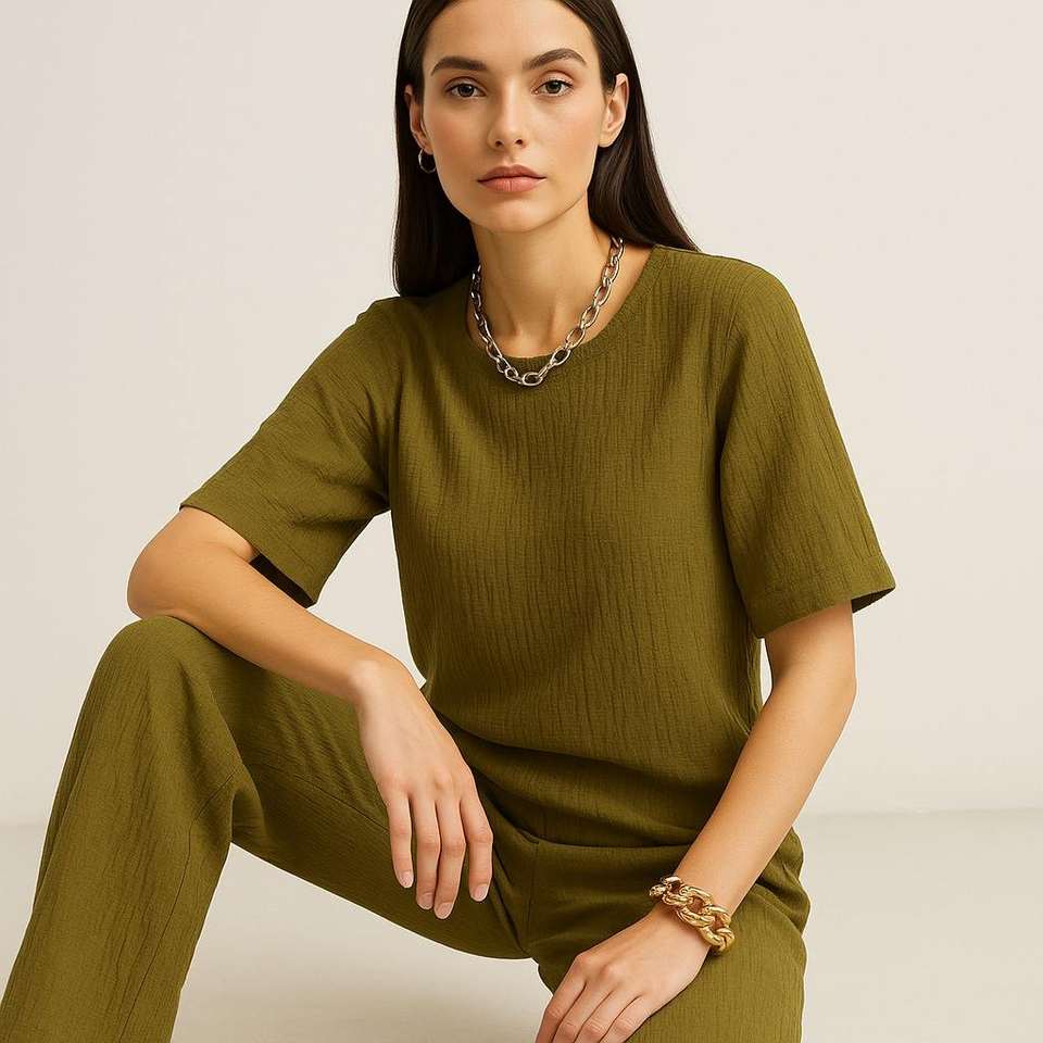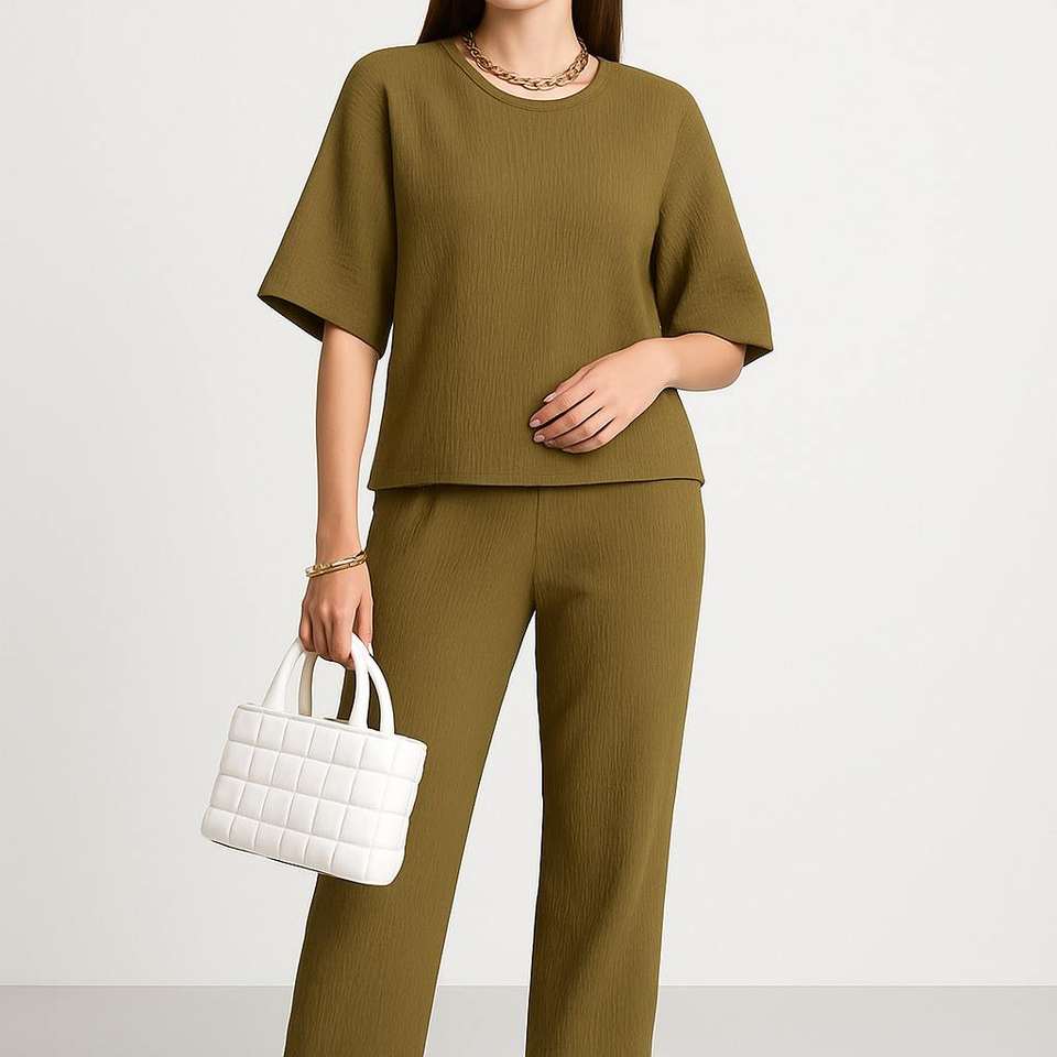 ชุดเซ็ตเสื้อแขนสั้นเนื้อผ้าพิเศษสำหรับผู้หญิง กางเกงเข้าชุด โพลีเอสเตอร์เนื้อนุ่ม ไซส์ M L XL XXL ขายส่ง