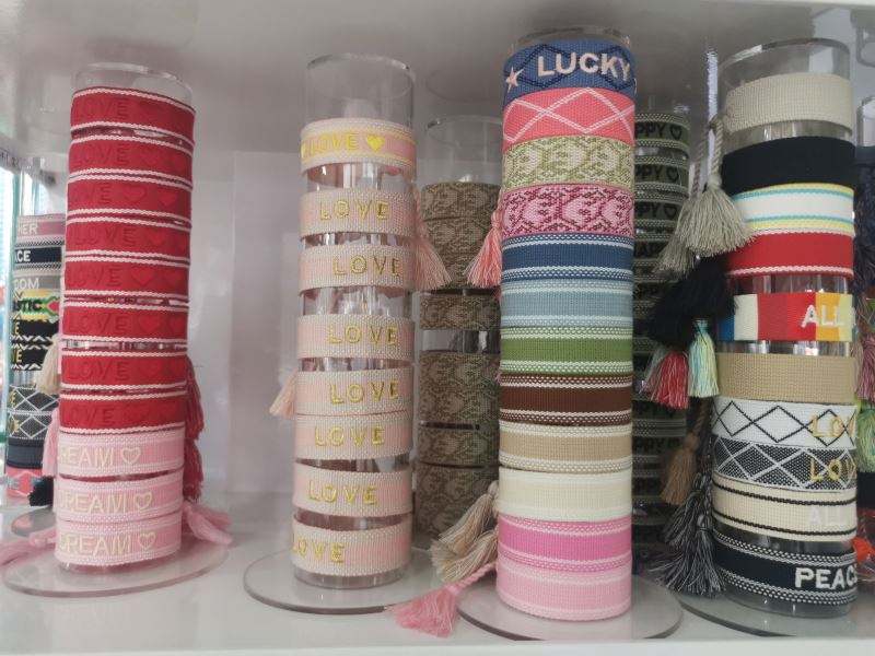นิทรรศการอุปกรณ์จัดงานแต่งงานปักตัวอักษรโลโก้สวยทอสร้อยข้อมือผ้าฝ้ายด้ายปรับพู่ริบบิ้นสร้อยข้อมือ