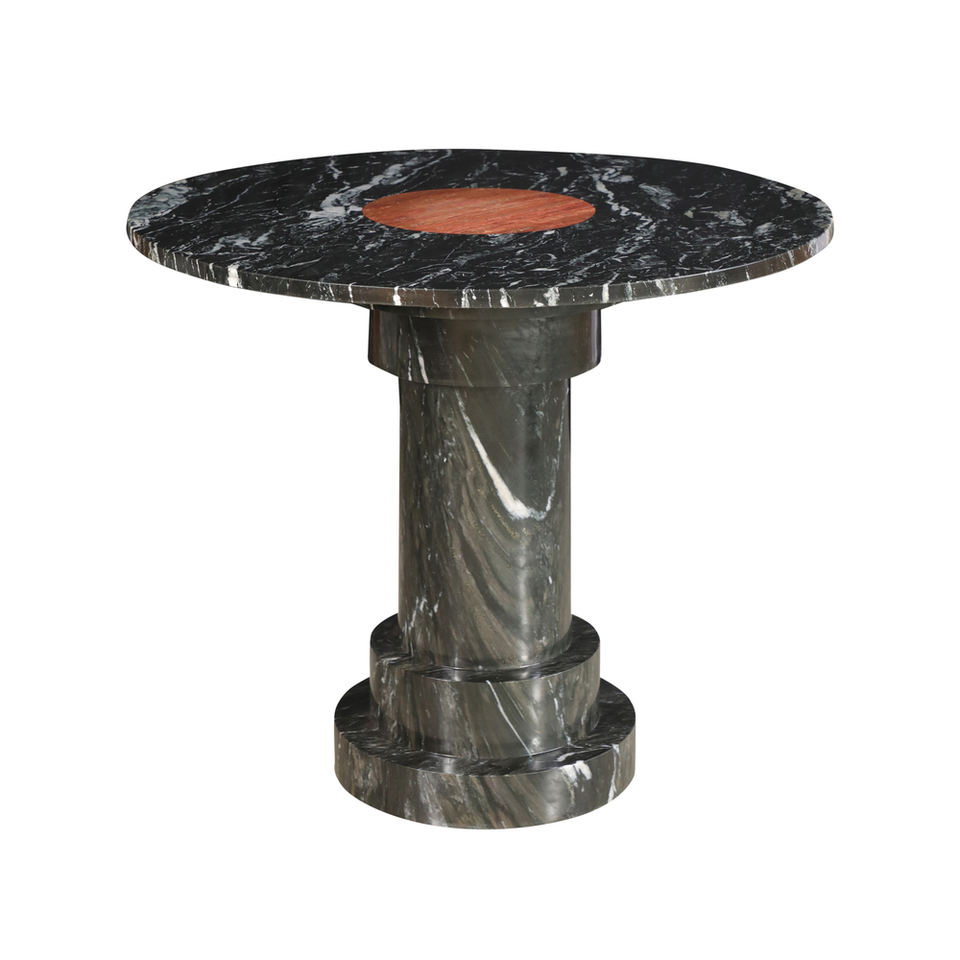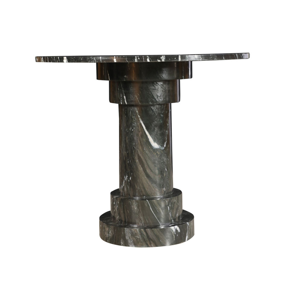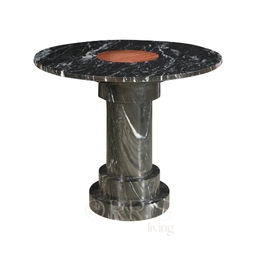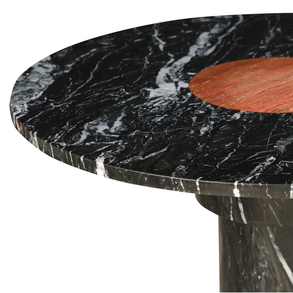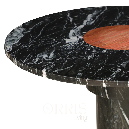 โต๊ะอาหารทรงกลมหินอ่อนดำธรรมชาติสุดหรู ดีไซน์โมเดิร์น ฐานทรงเสา ประดับด้วยหินศิลปะ เหมาะสำหรับวิลล่าหรูหรา ใช้ได้ทั้งห้องรับประทานอาหารและห้องนั่งเล่น
