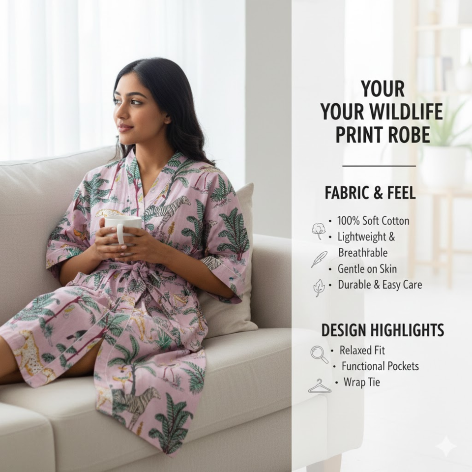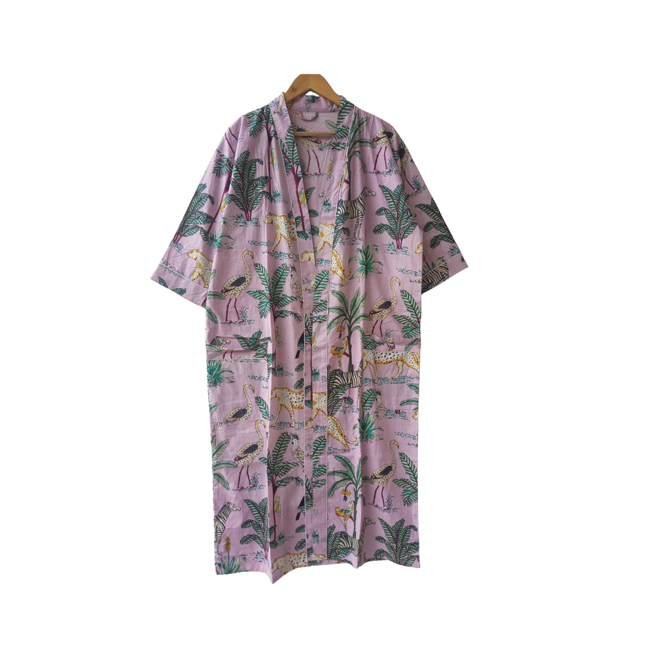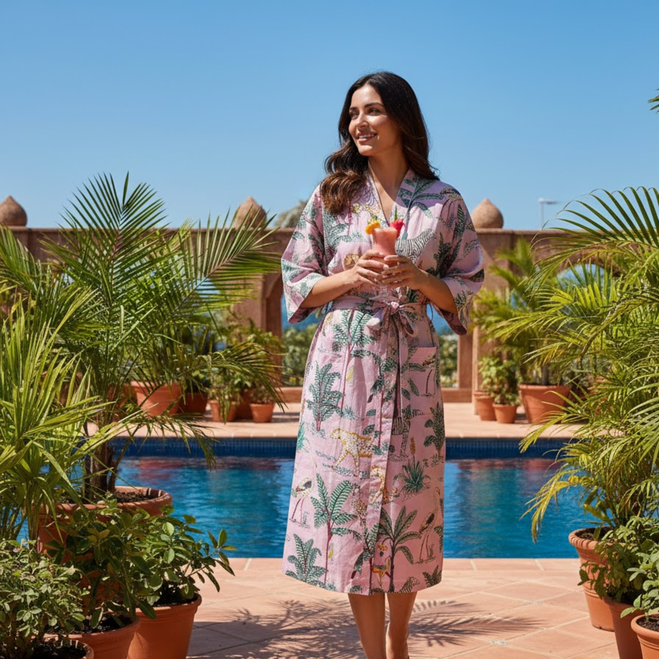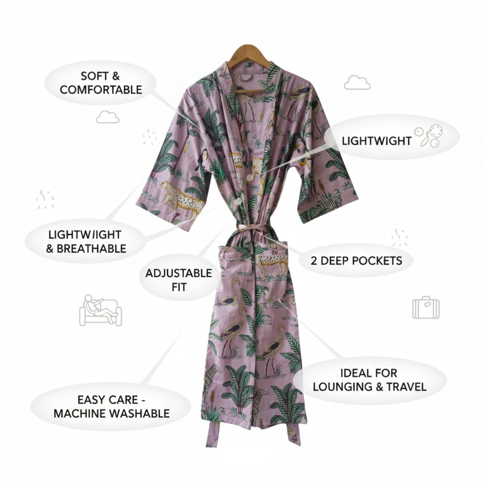 ชุดกิโมโนผ้าฝ้ายพิมพ์ลายป่าสีชมพูแปลกตาสำหรับผู้หญิง คอวี แขนยาว ความยาวเต็มตัว มีเชือกผูกเอว ชุดนอนลายทรอปิคอล