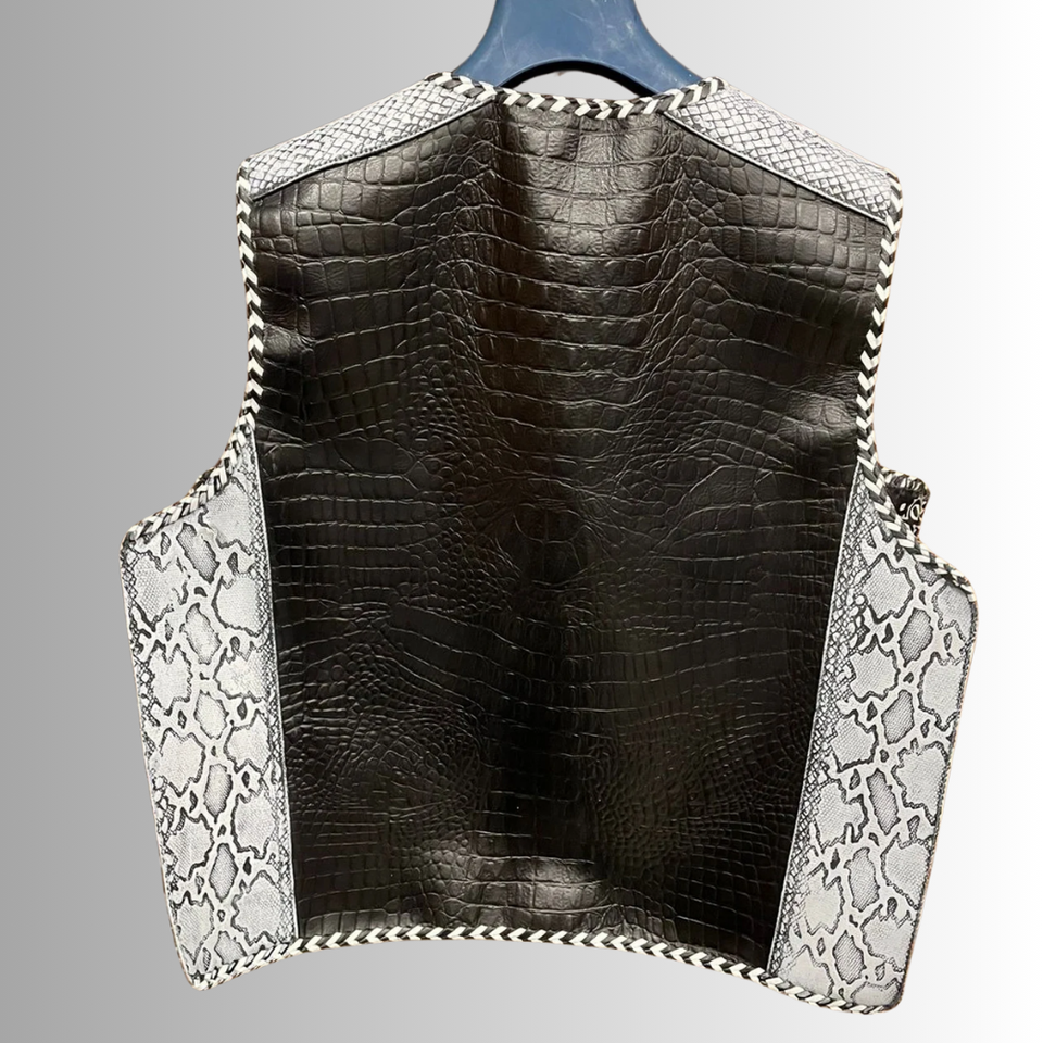 เสื้อกั๊กหนังงูหลามแปลกใหม่สำหรับผู้ชายหนังวัวแท้พร้อมหนังรถจักรยานยนต์ลายนูนหนังงูสำหรับผิวจระเข้