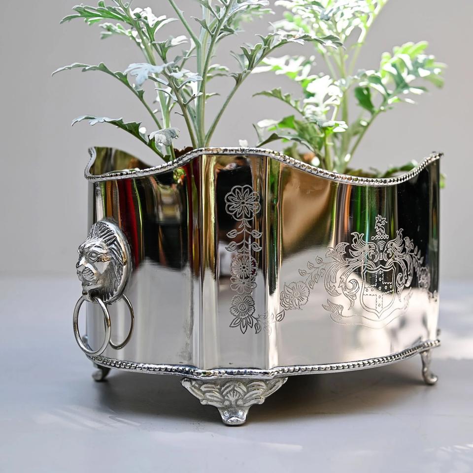 ที่ปลูกดอกไม้ทำจากโลหะเคลือบเงาพร้อมที่จับฐานและฐานวางของที่ทำจากโลหะกระจกสำหรับปลูกพืชแบบปรับแต่งได้