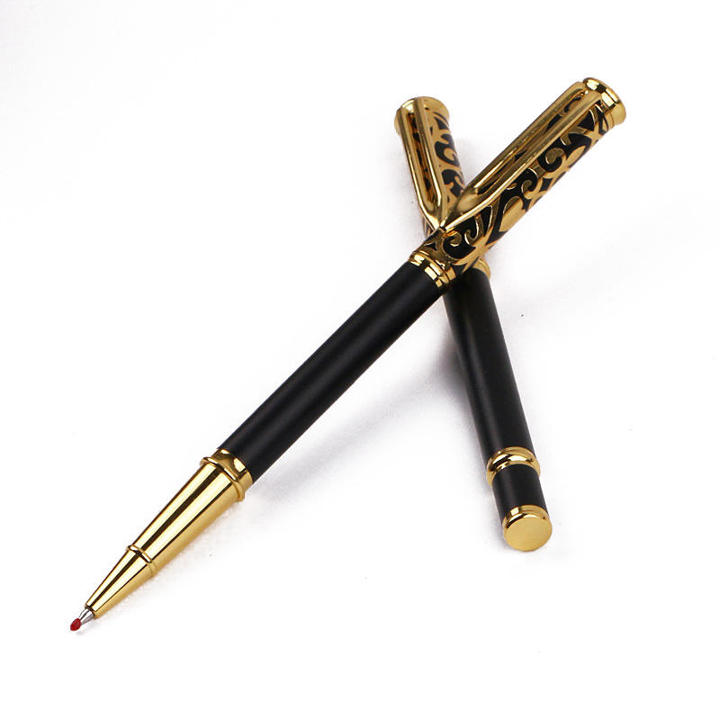 ปากกาลูกลื่นสีดำสำหรับธุรกิจปากกาลูกกลิ้งแบบปรับแต่งโลโก้โลหะสีทองของขวัญ