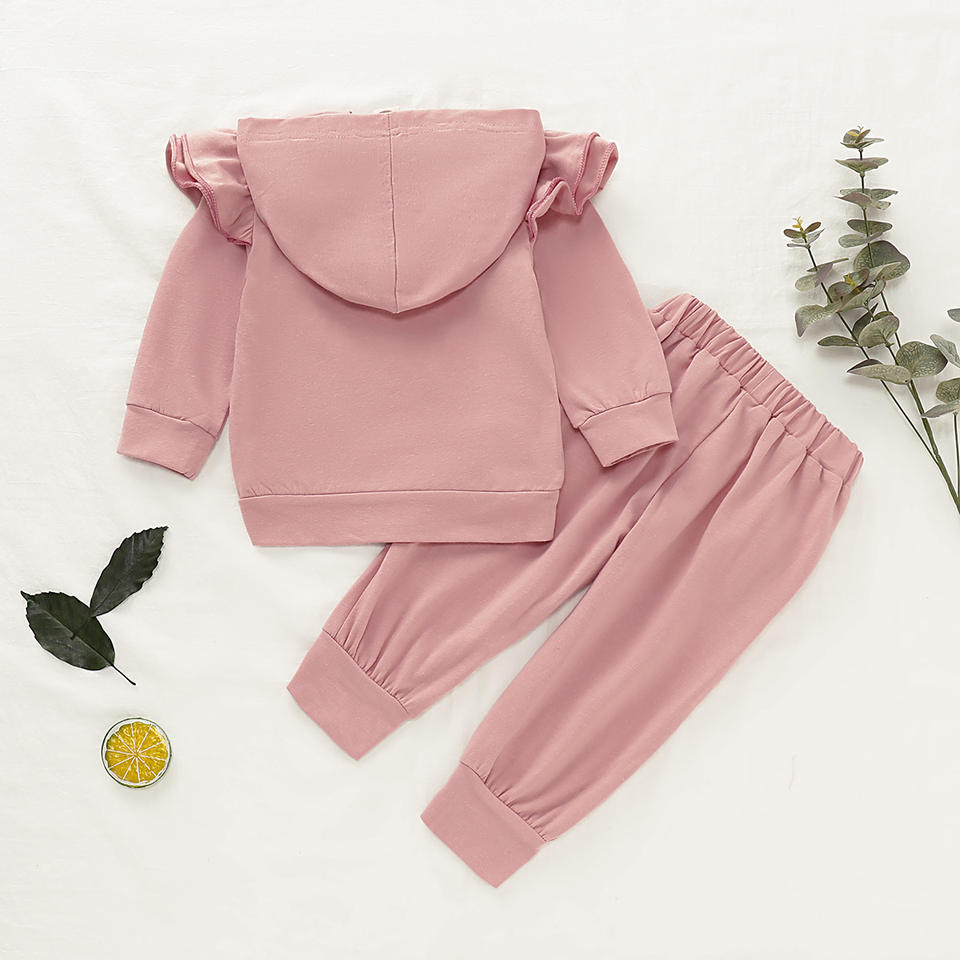 ชุดเสื้อผ้าเด็กผู้หญิงสไตล์ Explosion ชุดเสื้อสเวตเตอร์สีพื้นมีฮู้ดแขนลูกไม้ + กางเกงขายาว ชุดสองชิ้น ชุดเสื้อผ้าเด็ก