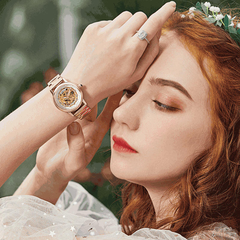 นาฬิกาข้อมือผู้หญิง แฟชั่น กลไกอัตโนมัติ โครงสร้างโปร่งใส สายสแตนเลสอะคริลิก หน้าปัด 35 มม. กันน้ำ 30 เมตร เรืองแสง
