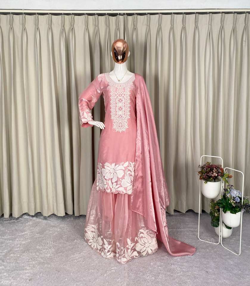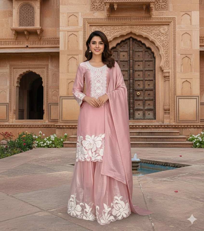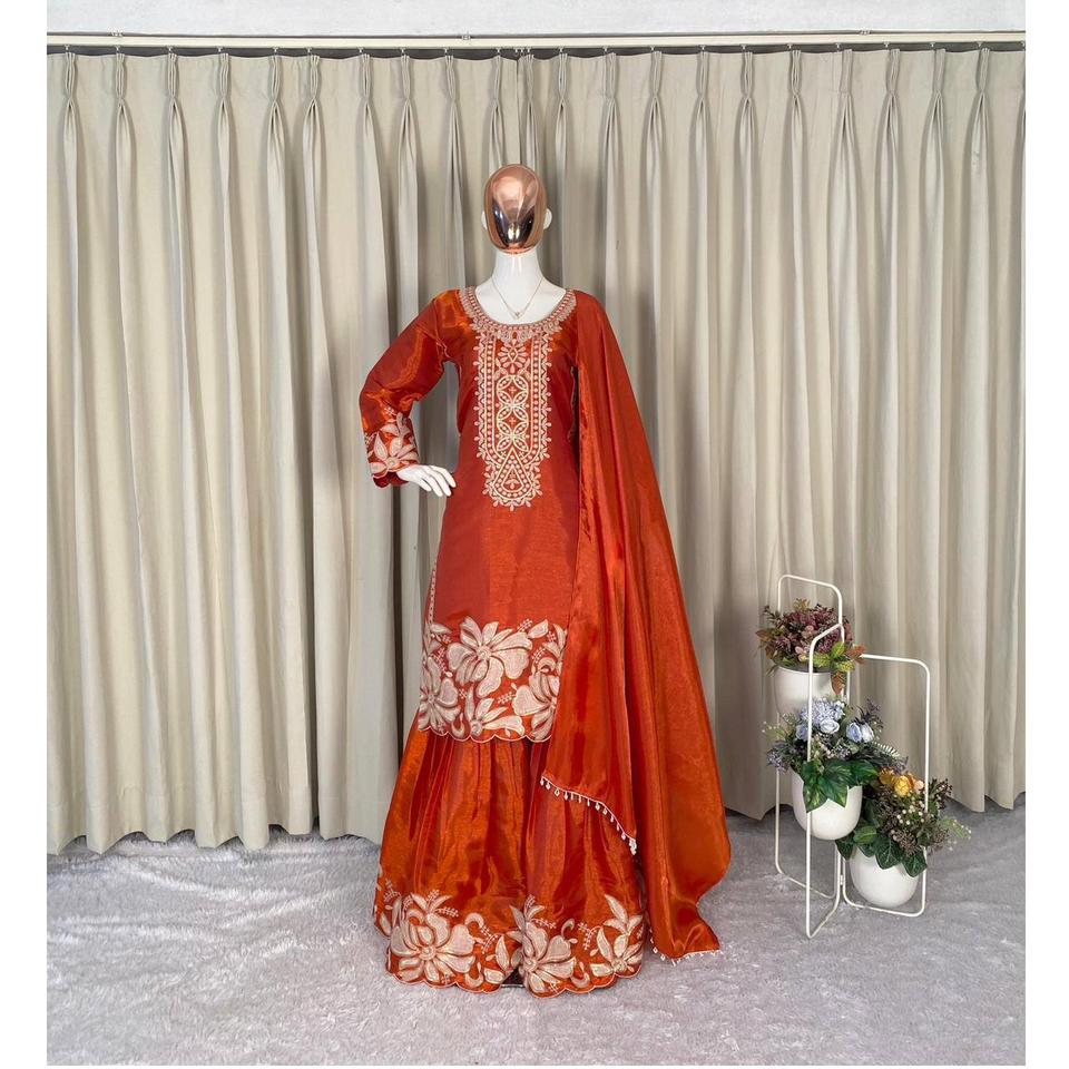 ชุดชาราร่าพร้อมผ้าคลุมไหล่สำหรับส่งออก เหมาะสำหรับงานปาร์ตี้และงานแต่งงาน เสื้อออกแบบโดยดีไซเนอร์ของเราจับคู่กับชาราร่าผ้าไหมกิมมี่
