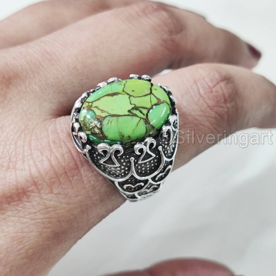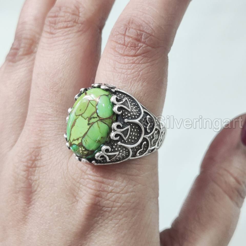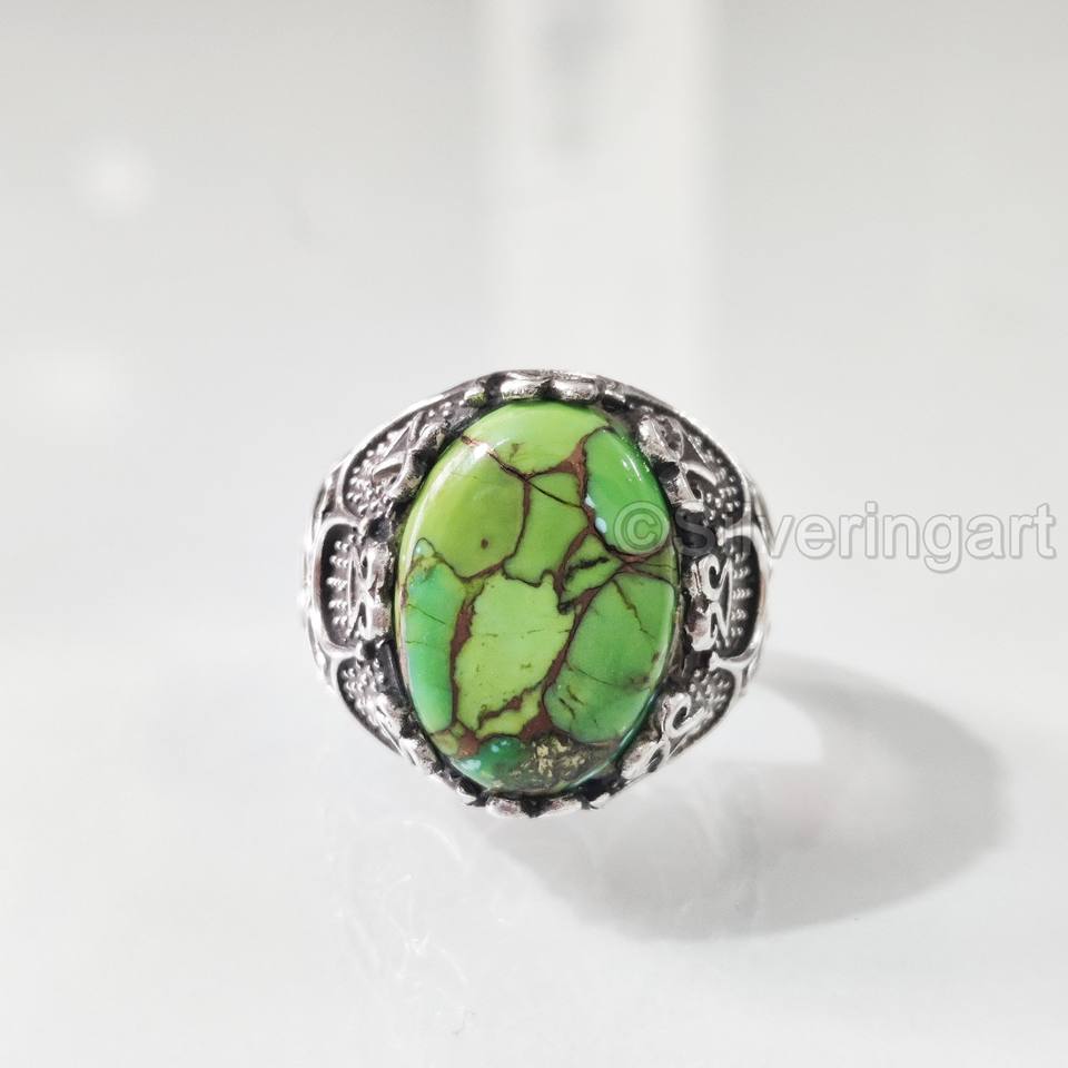 แหวนผู้ชายส่งออกแหวนทองแดงสีเขียวเทอร์ควอยซ์ธรรมชาติแหวนพลอย December เครื่องประดับปาร์ตี้อาหรับแหวนเงินสเตอร์ลิง925