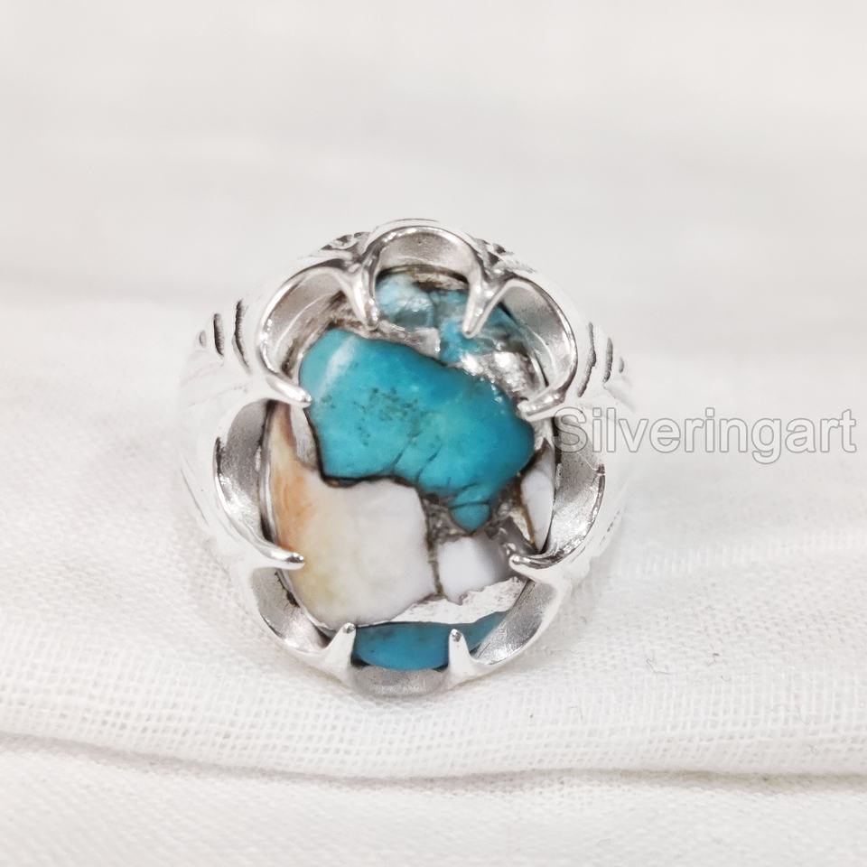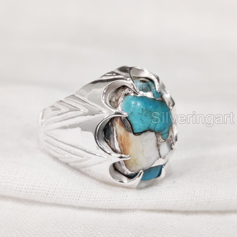 แหวนเงินแท้ 925 ประดับมุกธรรมชาติ ทองแดง และเทอร์ควอยซ์ สำหรับผู้ชาย ของขวัญวันเกิดเดือนธันวาคม เครื่องประดับสไตล์ยิปซี