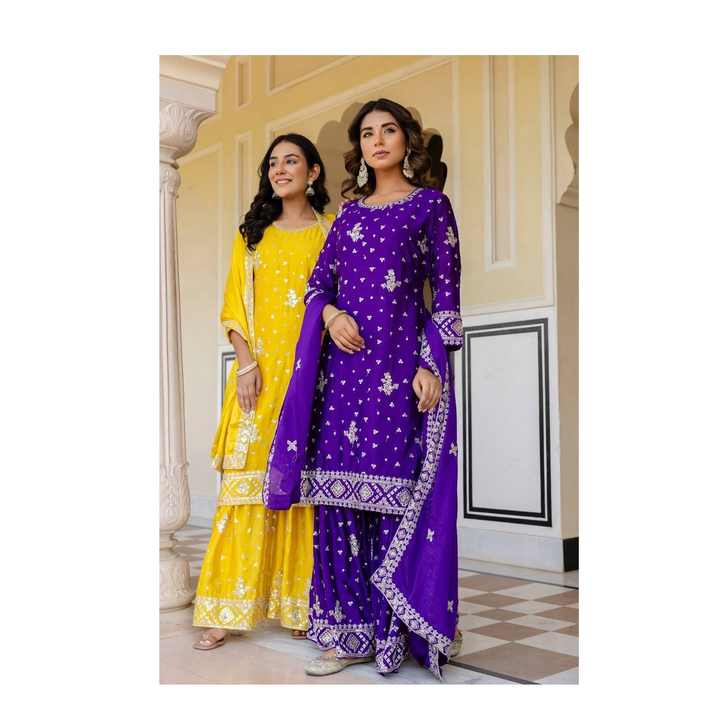 ชุดสูทซัลวาร์ปากีสถานสำหรับงานแต่งงานและงานเลี้ยงผ้าชินน่อนปักลาย