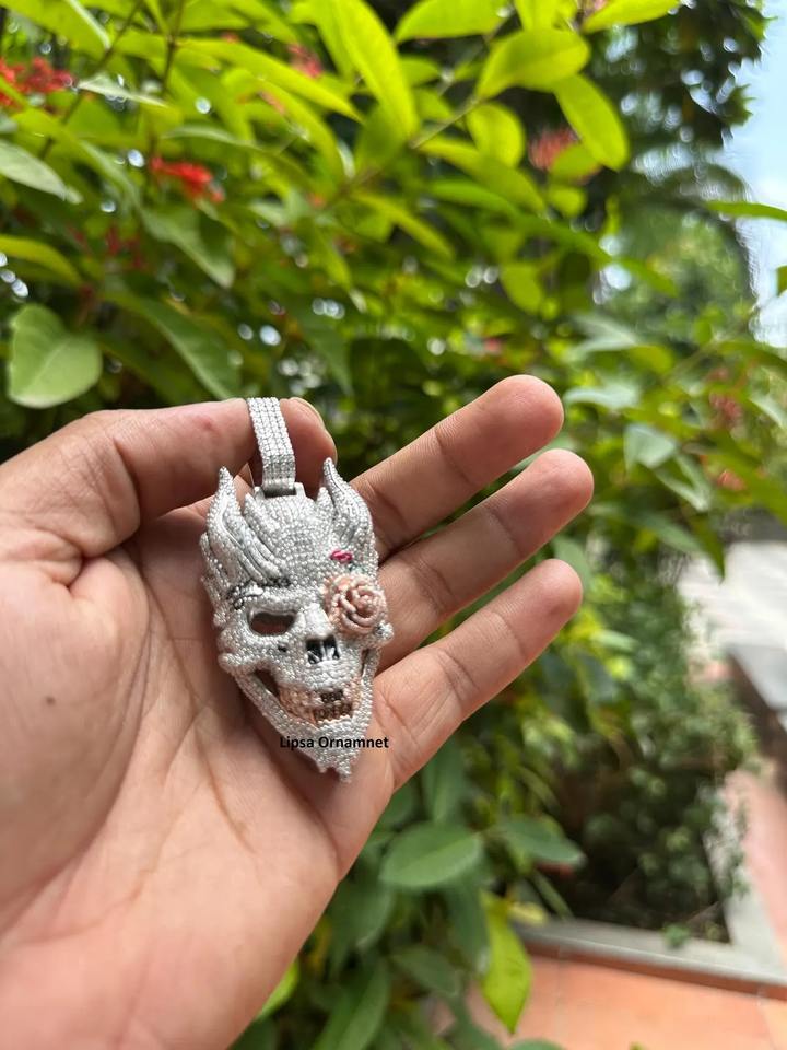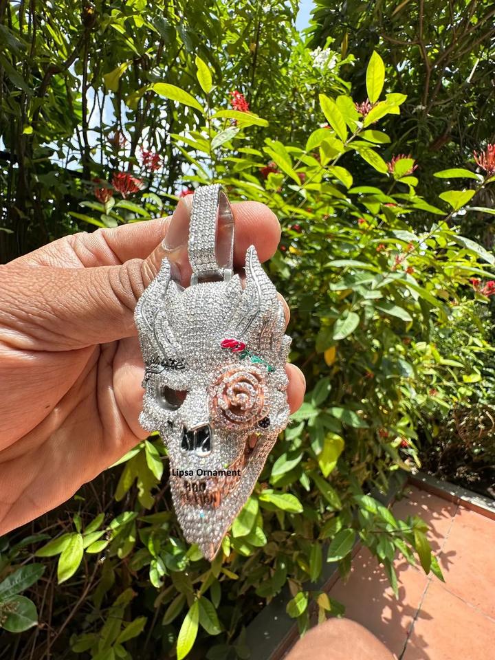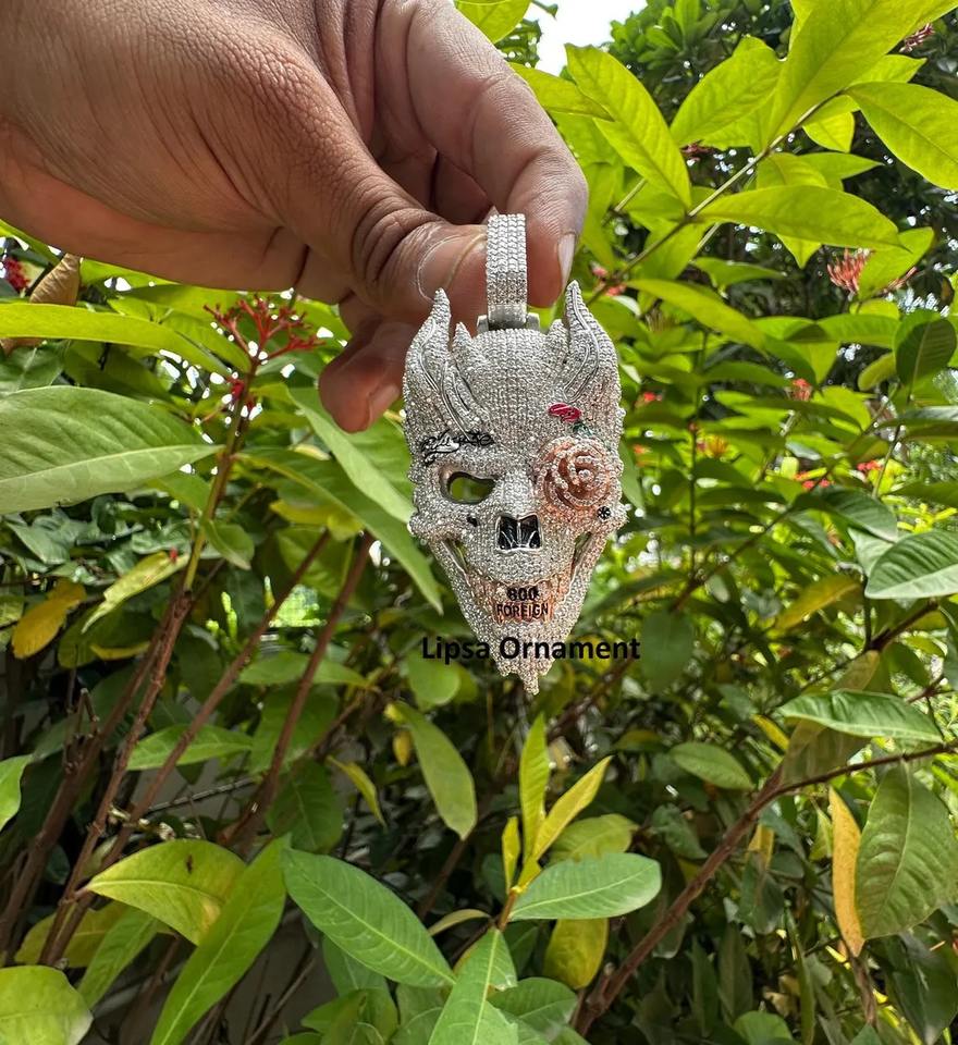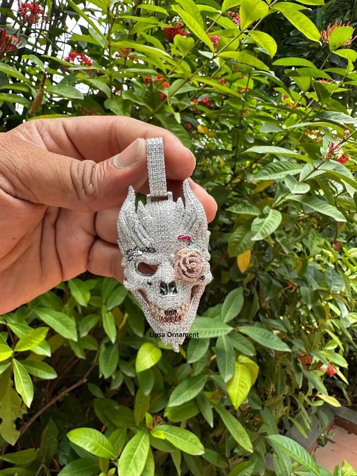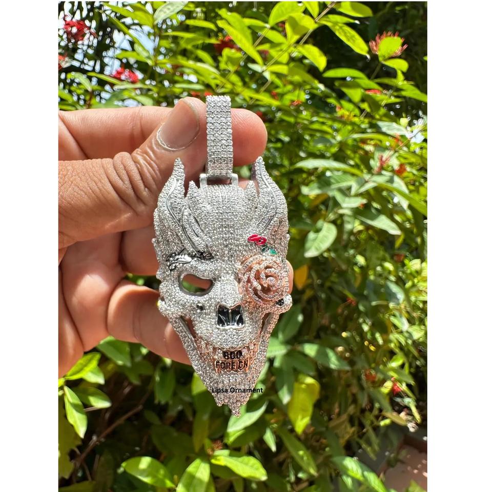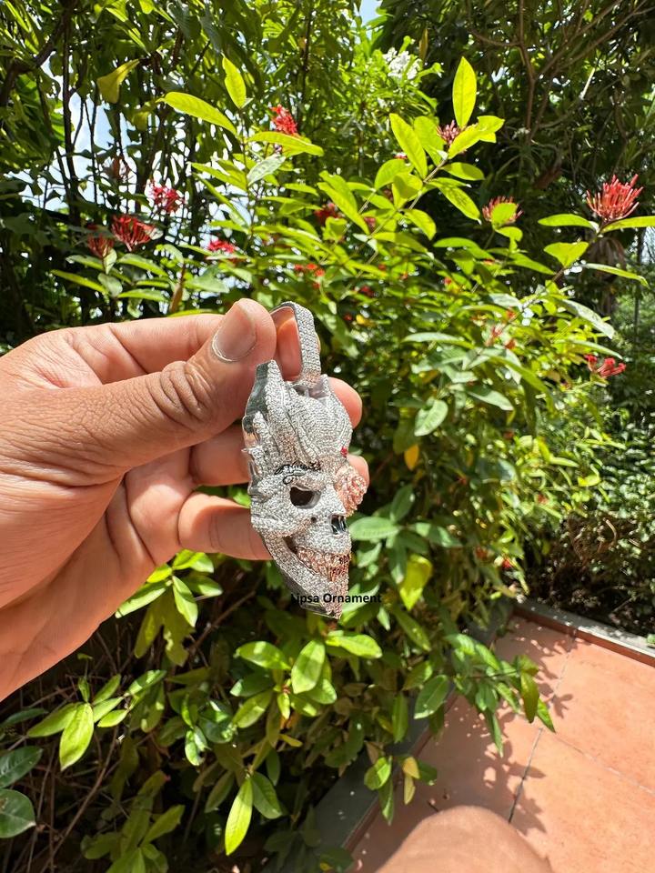 จี้หน้ากากปีศาจแบบฮิปฮอป คุณภาพส่งออก งานสั่งทำพิเศษ ฝังเพชรโมอิสซาไนต์ ตัวเรือนสแตนเลสชุบโรเดียม พร้อมใบรับรอง IGI