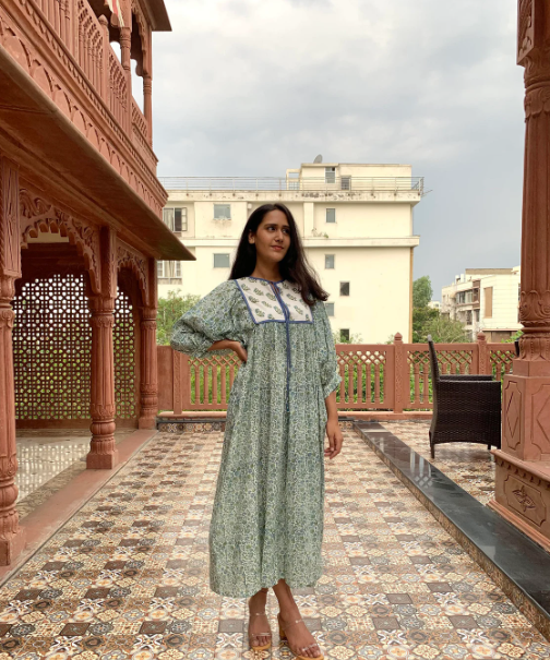 Jaipuri ชุดเดรสผ้าฝ้ายแขนยาวสำหรับผู้หญิง,ชุดเดรสพิมพ์ลายสไตล์ทรงหลวมผลิตจากผ้าฝ้าย100%