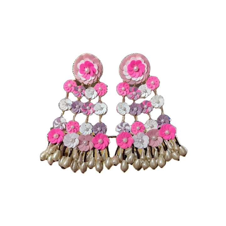 ต่างหูลูกปัดดอกไม้ทำด้วยมือสีชมพูและสีขาวพร้อมพู่ไข่มุกเครื่องประดับสำหรับผู้หญิงและเด็กผู้หญิง