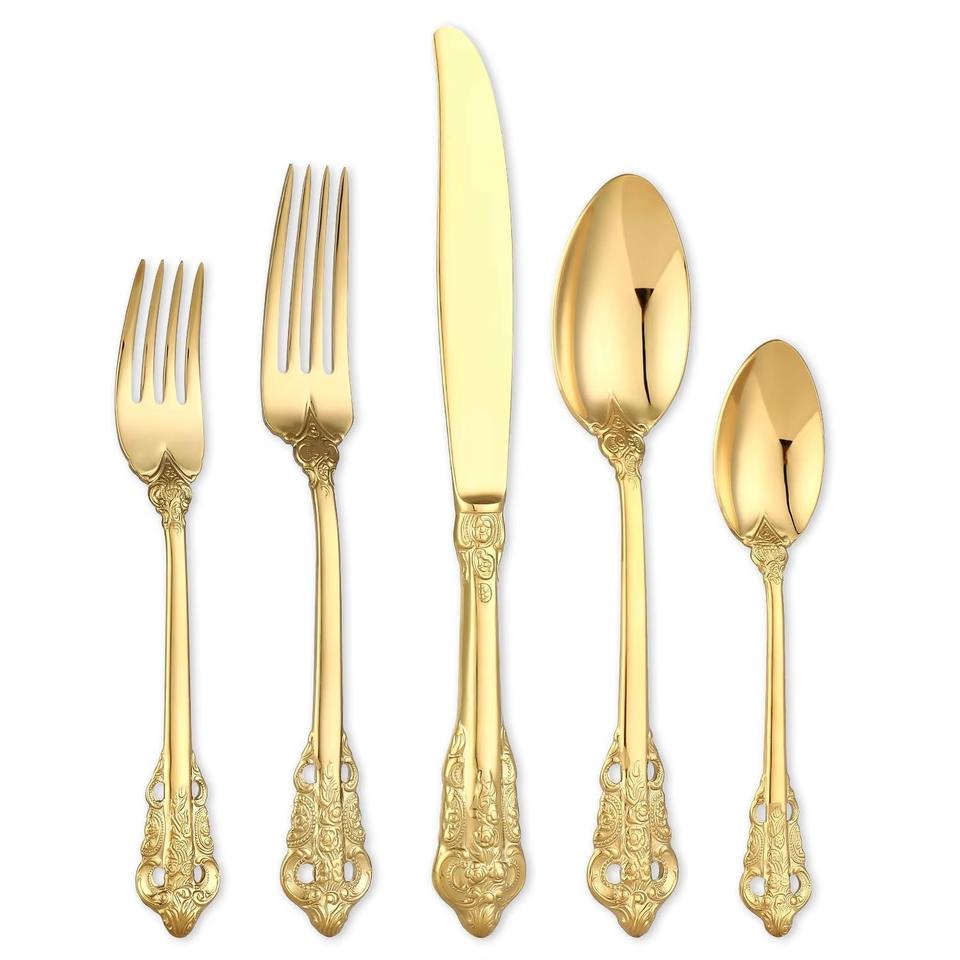 ชุดช้อนส้อมสแตนเลสคุณภาพส่งออก ดีไซน์หรูหรา พร้อมด้ามจับลายดอกไม้สีทองแบบนูน ตกแต่งสไตล์ราชวัง