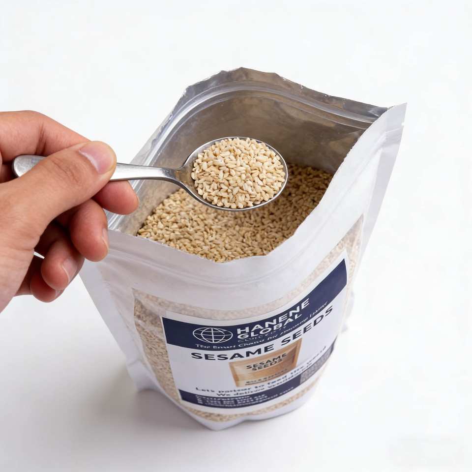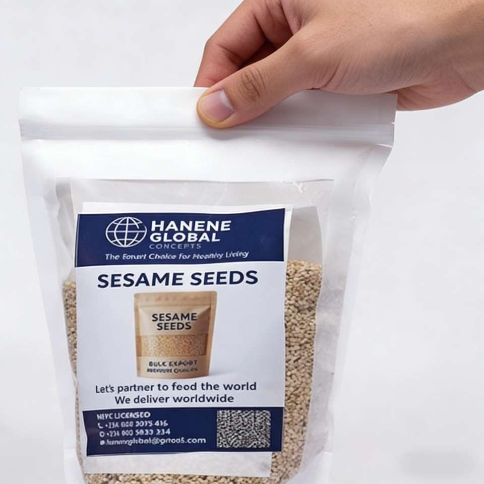 งาขาวคุณภาพส่งออก สีทองสม่ำเสมอ แตกหัก 3% น้ำมันสูงสุด 50% มีทั้งแบบมีเปลือกและไม่มีเปลือก น้ำหนัก 250 กรัม อายุการเก็บรักษา 1-2 ปี