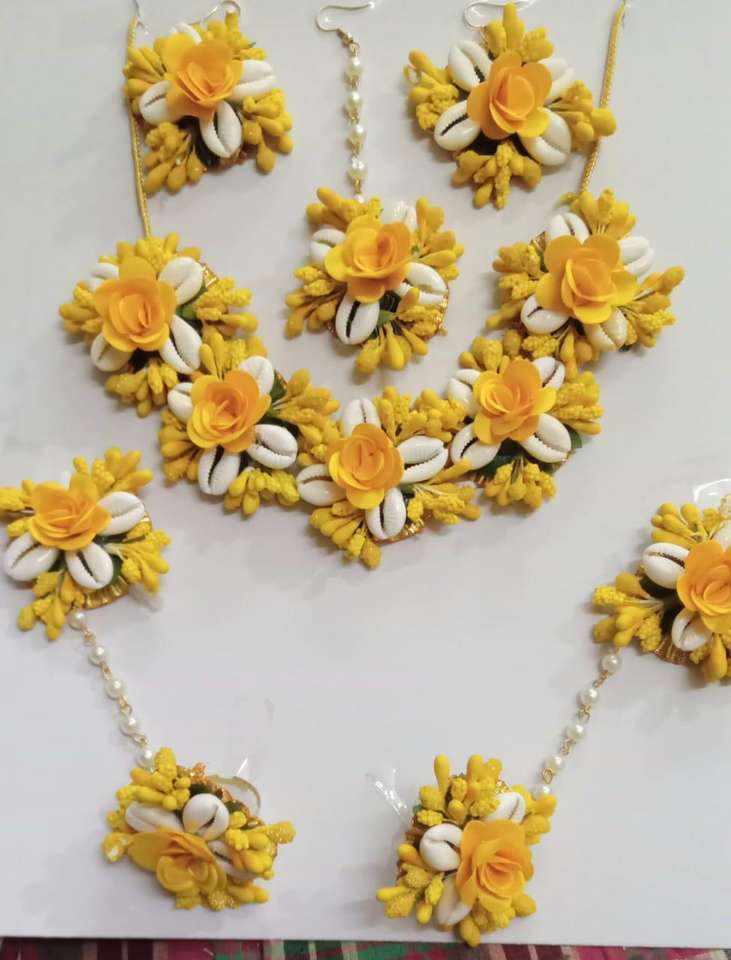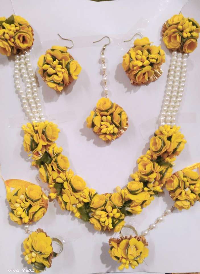 ชุดเครื่องประดับเจ้าสาวลายดอกไม้สีเหลืองสีขาวพร้อมไข่มุก haldi และ mehendi สำหรับพิธีการออกแบบสายแบบปรับได้