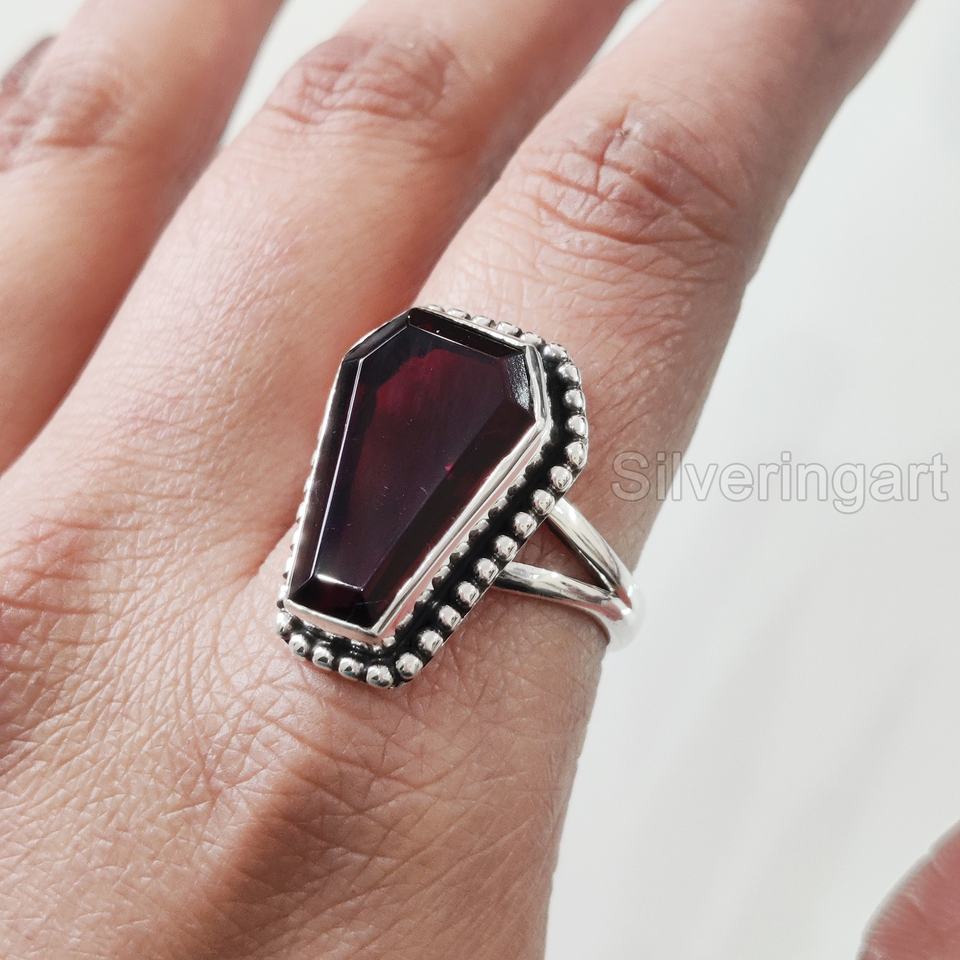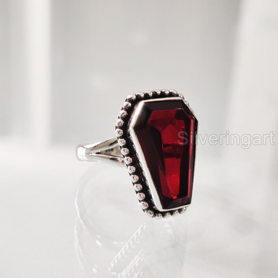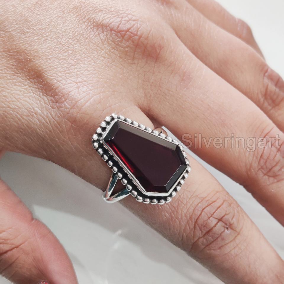 ส่งออกแหวนโลงธรรมชาติโกเมนสีแดงโกเมนพลอย925สำหรับผู้หญิงหินนำโชคสำหรับงานแต่งงานทำด้วยมือแหวนโลงแหวนเงินสเตอร์ลิง