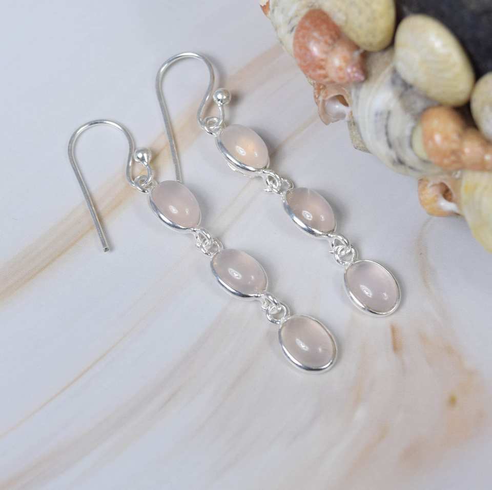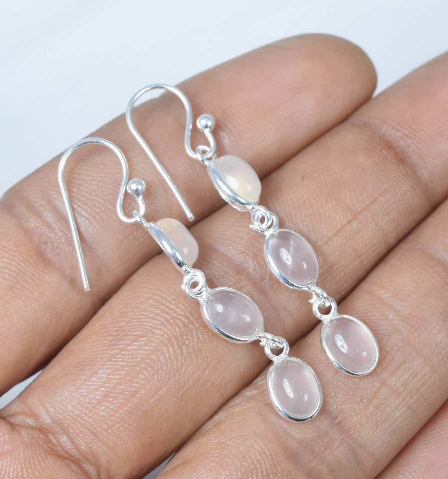 ชุดกรอบวงรีตัดเป็นรูปวงรีต่างหูควอตซ์อัญมณีดอกกุหลาบสีชมพูธรรมชาติแบบห้อย925 3ชิ้นเครื่องประดับเงินแท้